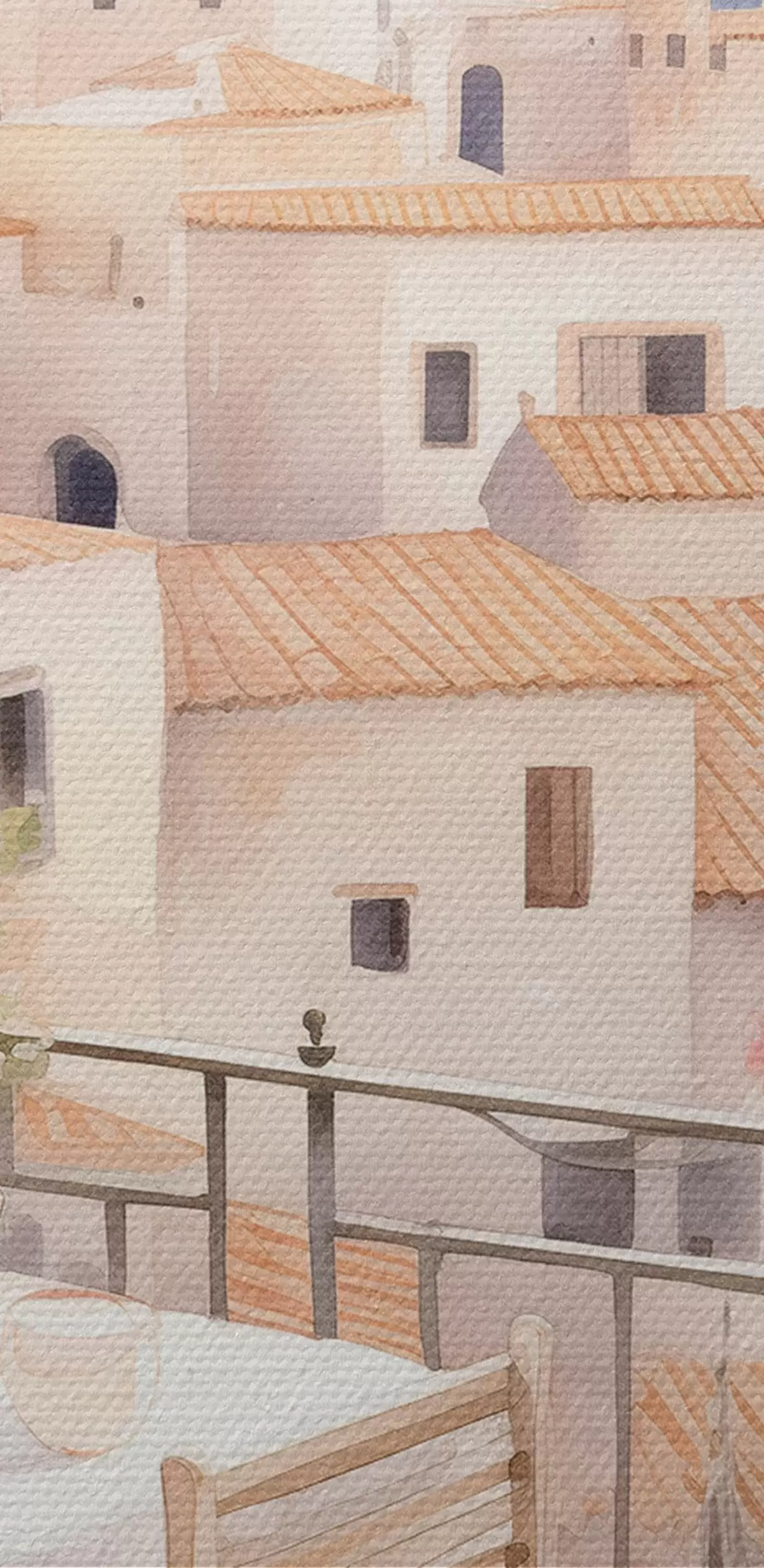 Schilderij Zonsondergang op het balkon, Italië, architectuur, bloeiende bloemen, aquarel stijl Art. s43184