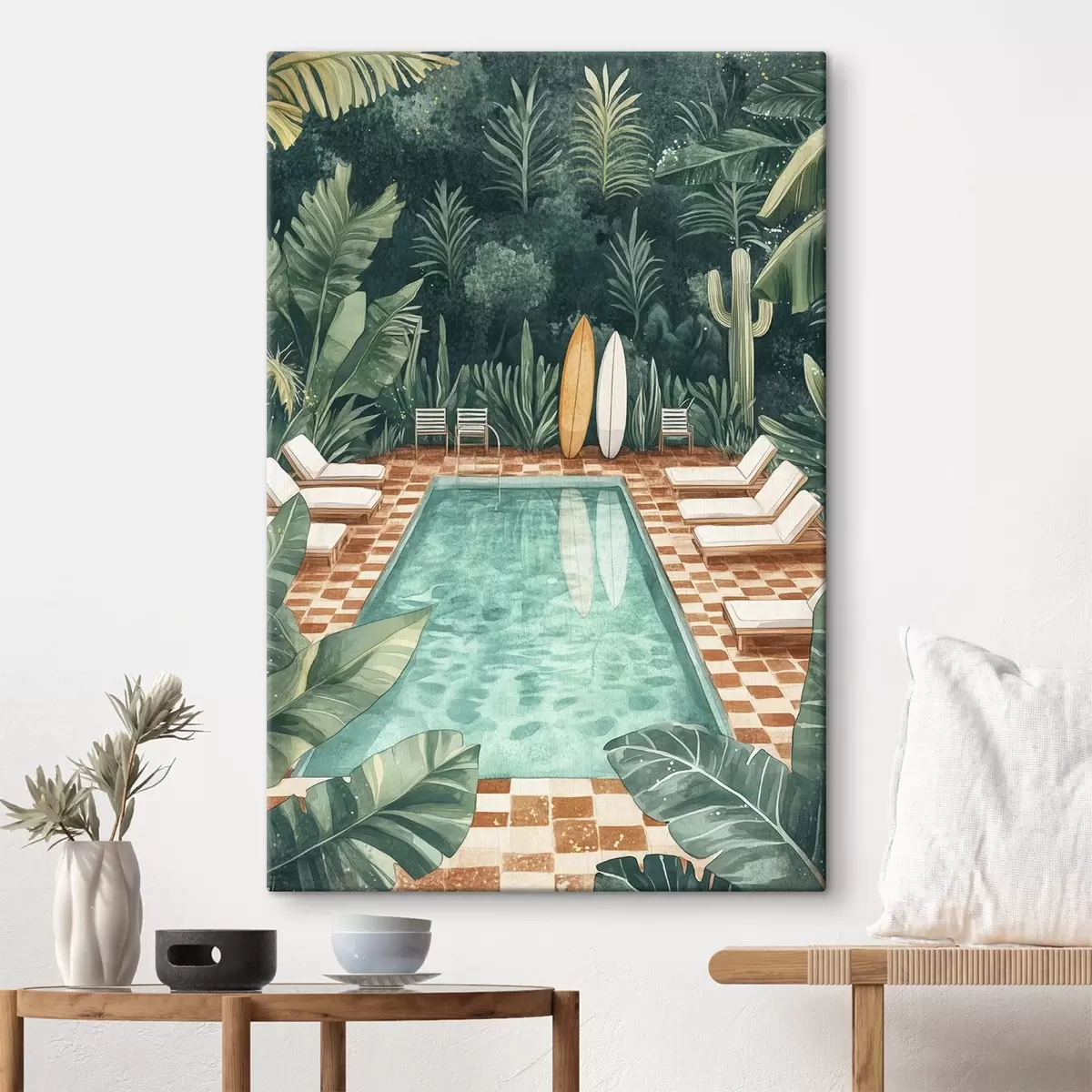 Schilderij Vintage zomerzwembad, tropisch bos, groen, palmbomen, aquarelstijl Art. s43191