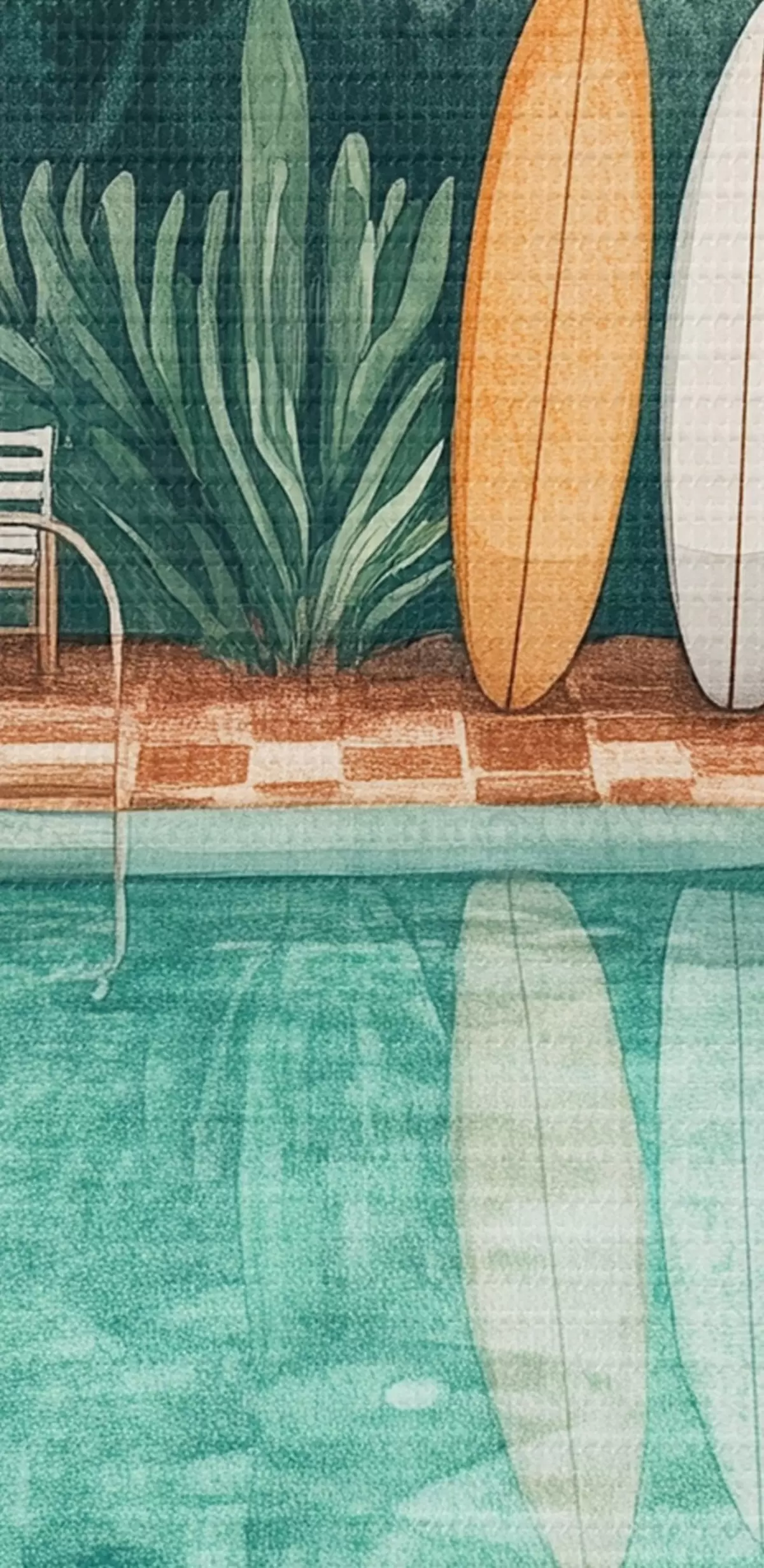 Schilderijen Vintage zomerzwembad, tropisch bos, groen, palmbomen, aquarelstijl s43191
