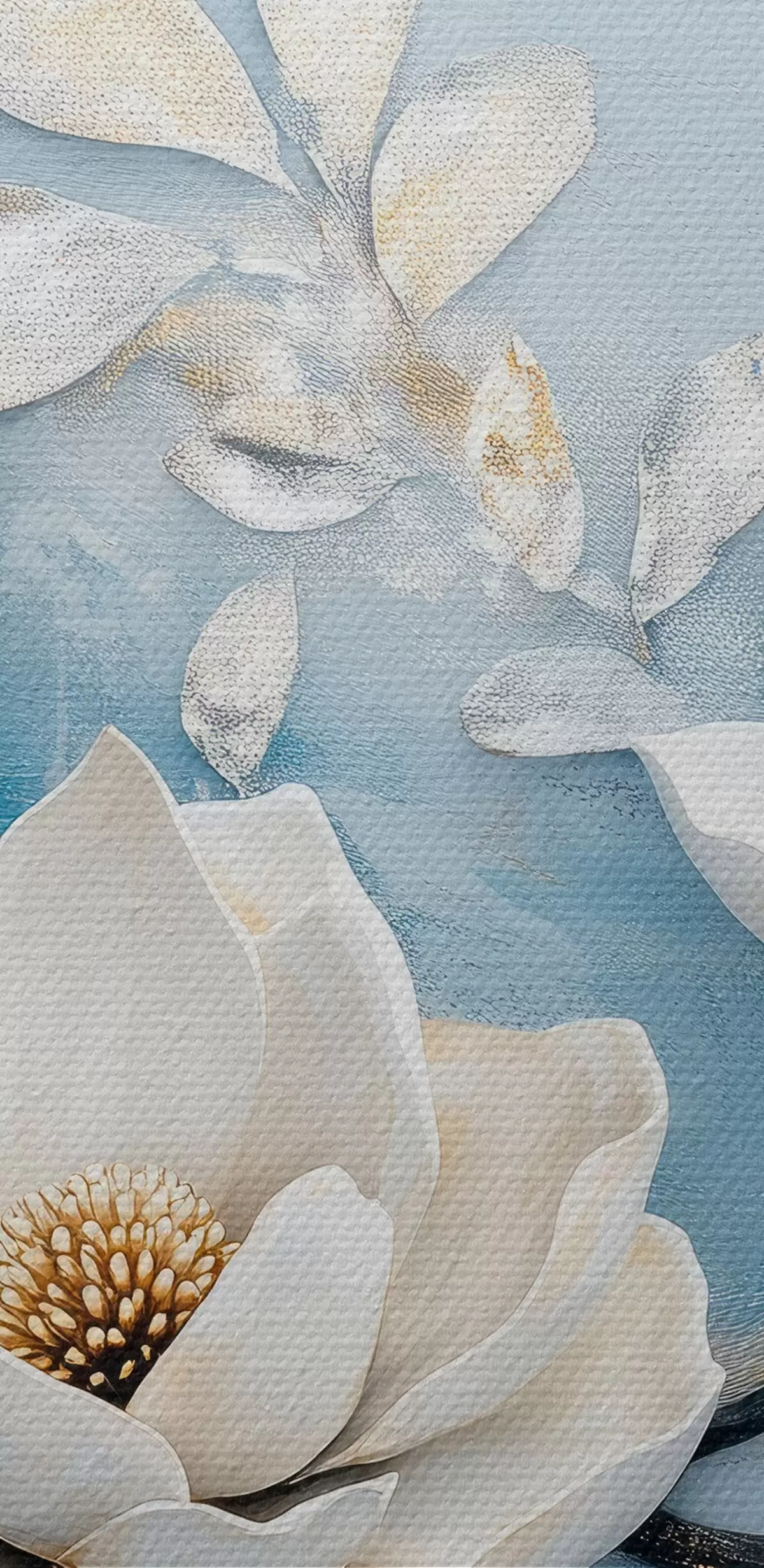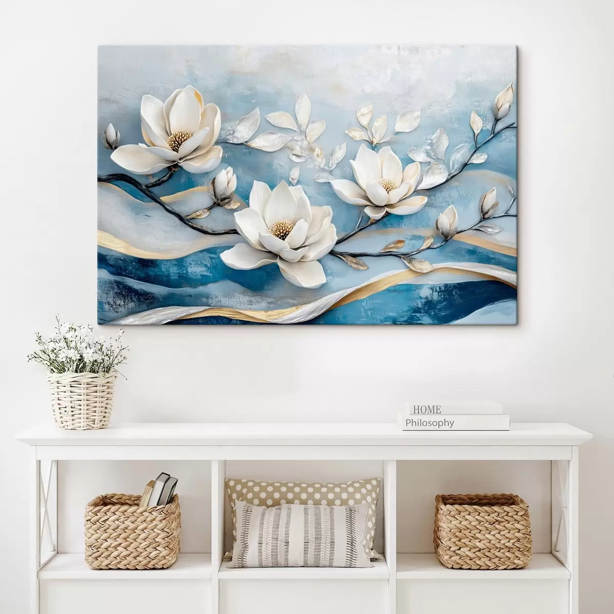 Schilderij Magnolia tak op een abstracte blauw-gele achtergrond Art. s43323