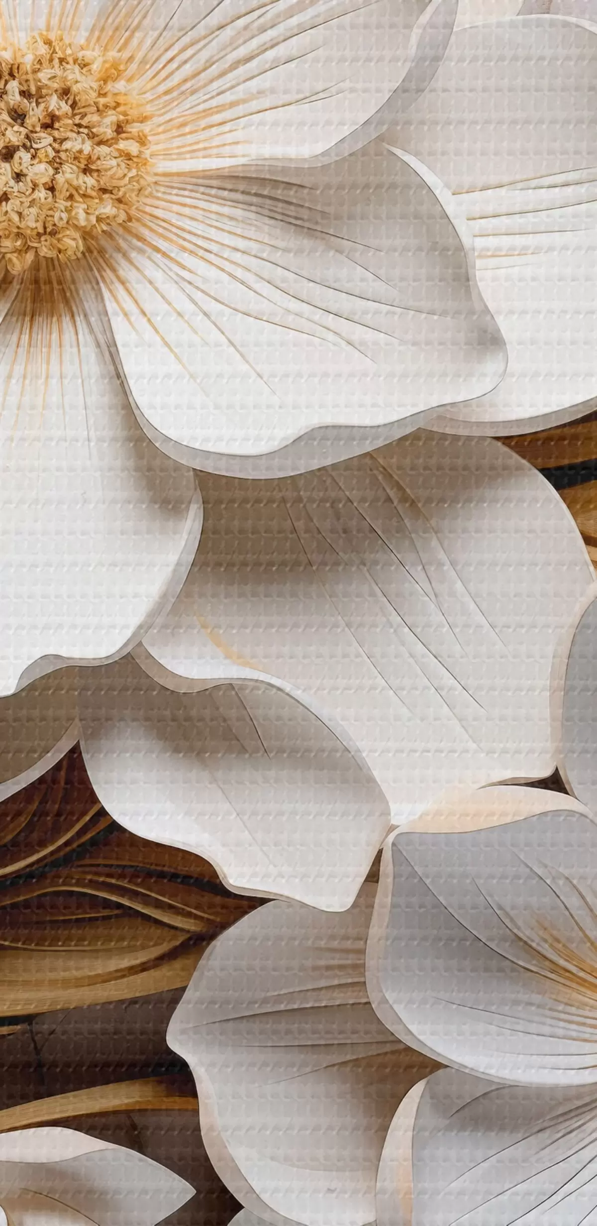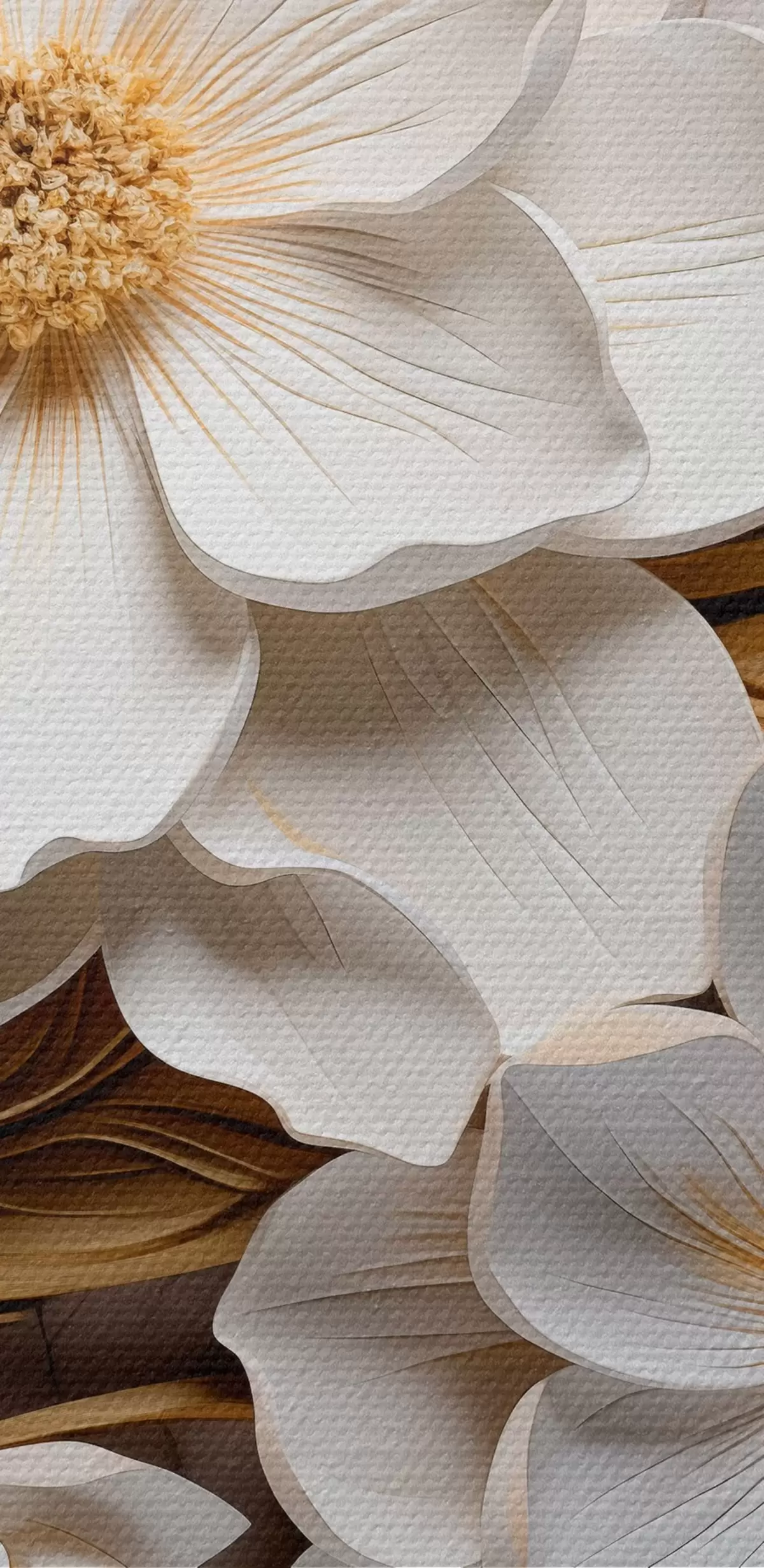 Schilderij Witte bloemen in de stijl van een reliëf fresco met gele bladeren en meeldraden Art. s43330