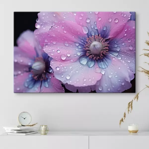 Schilderijen Roze en paarse bloemen in volle bloei bedekt met waterdruppels, op donkere achtergrond s43394