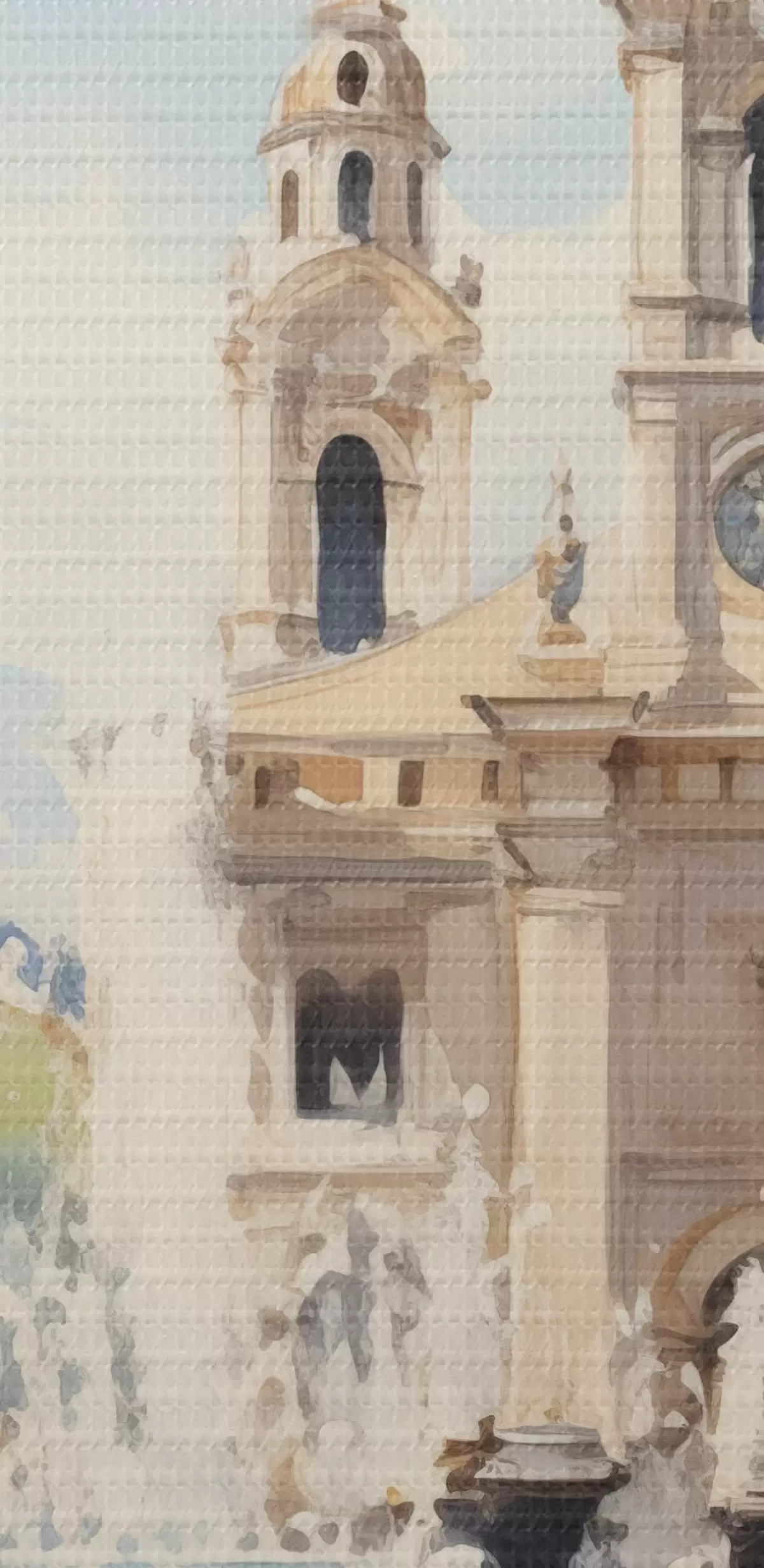 Schilderijen Abstract stadsgezicht met toren en een fontein op een stadsplein, bergen in de verte, aquarelstijl s43397