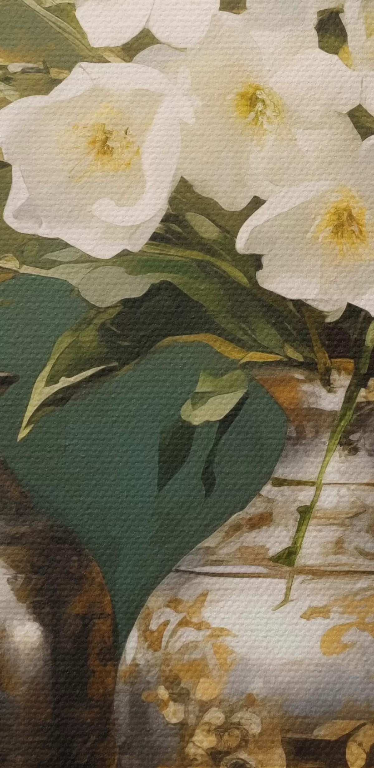Schilderij Een stilleven van witte bloemen in een vaas, met decoratieve vazen en een schaal op een groene tafel, donkergroene achtergrond Art. s43408