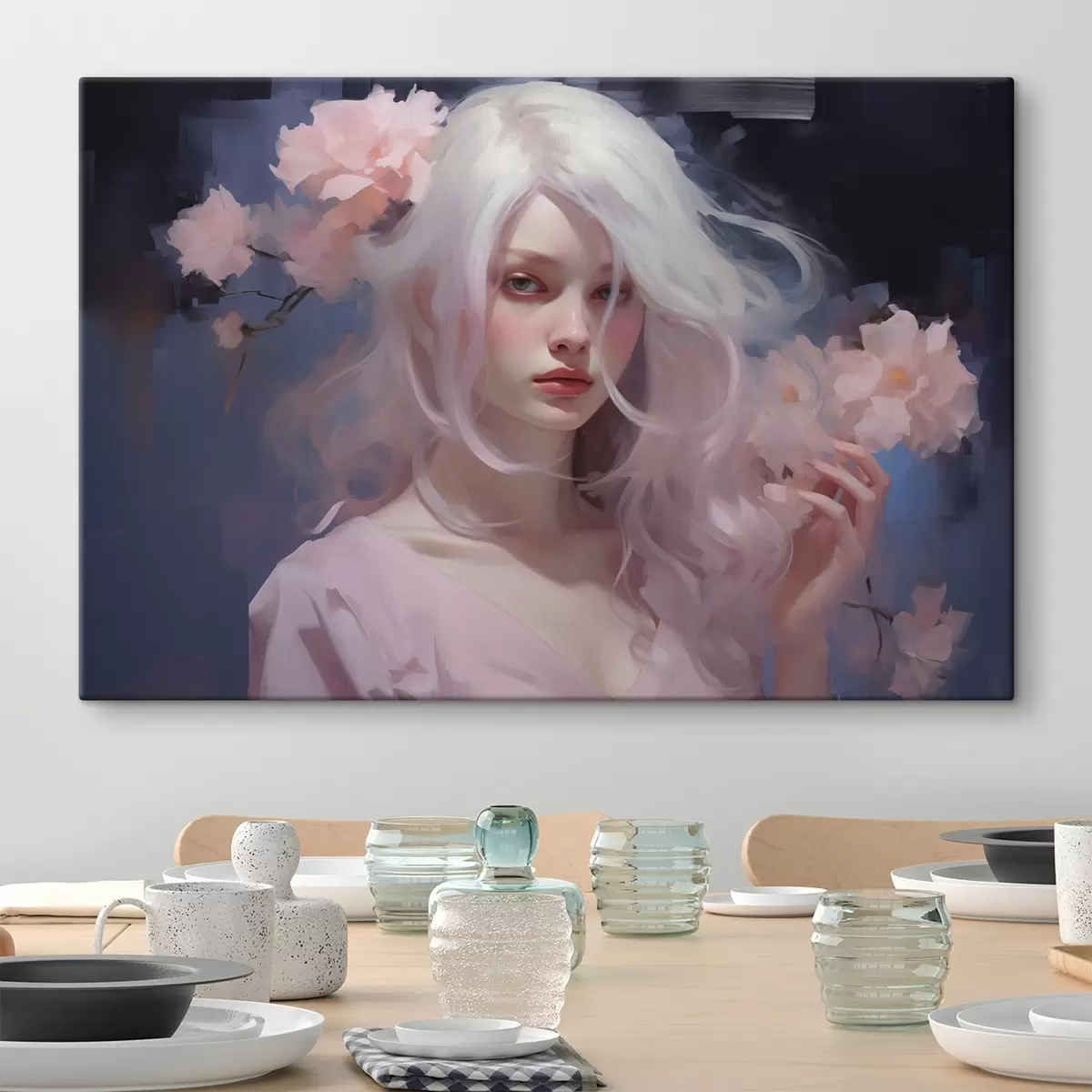 Schilderijen Meisje met pioenrozen, tekening in acrylstijl, donkere achtergrond  s43496