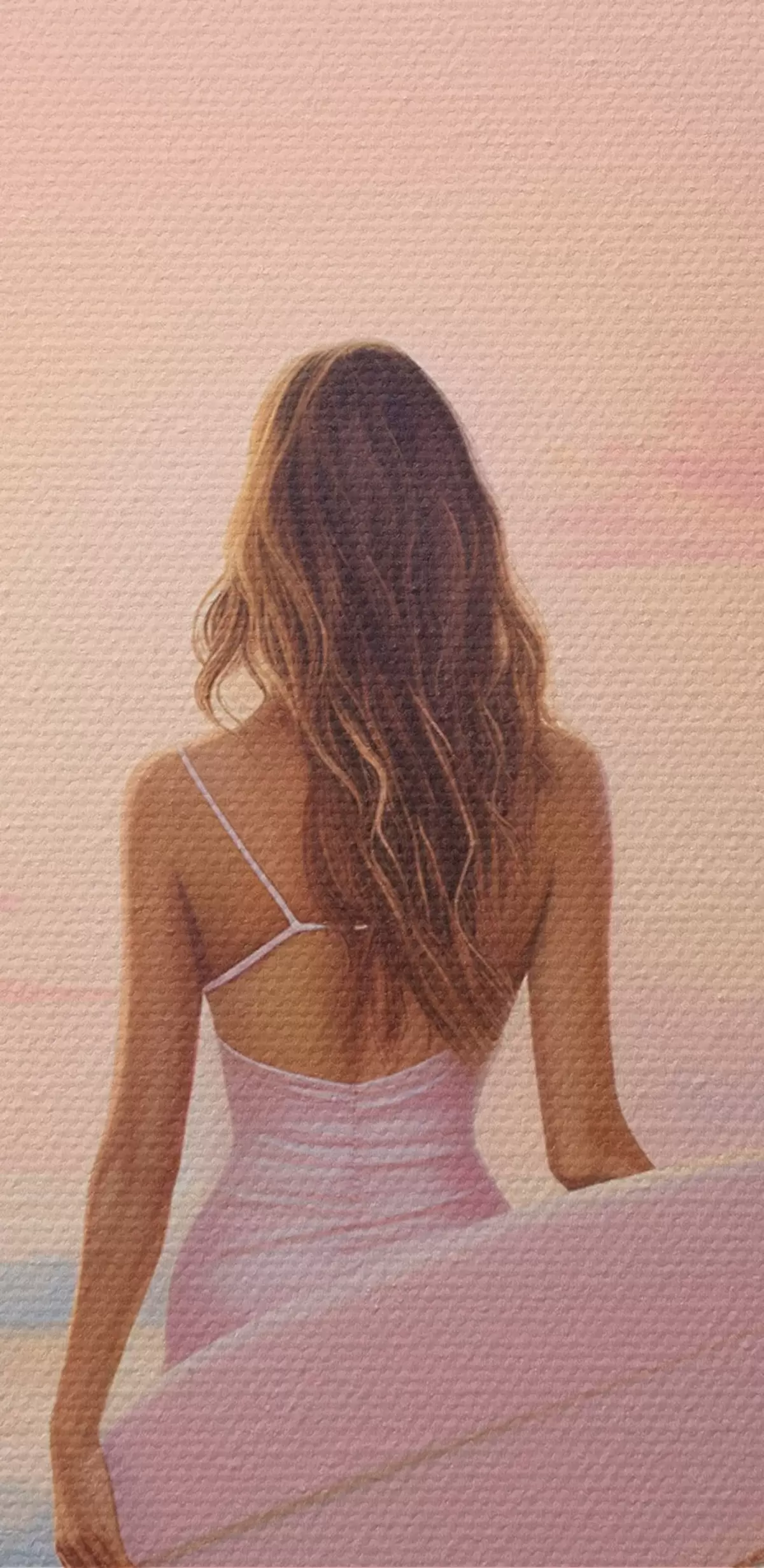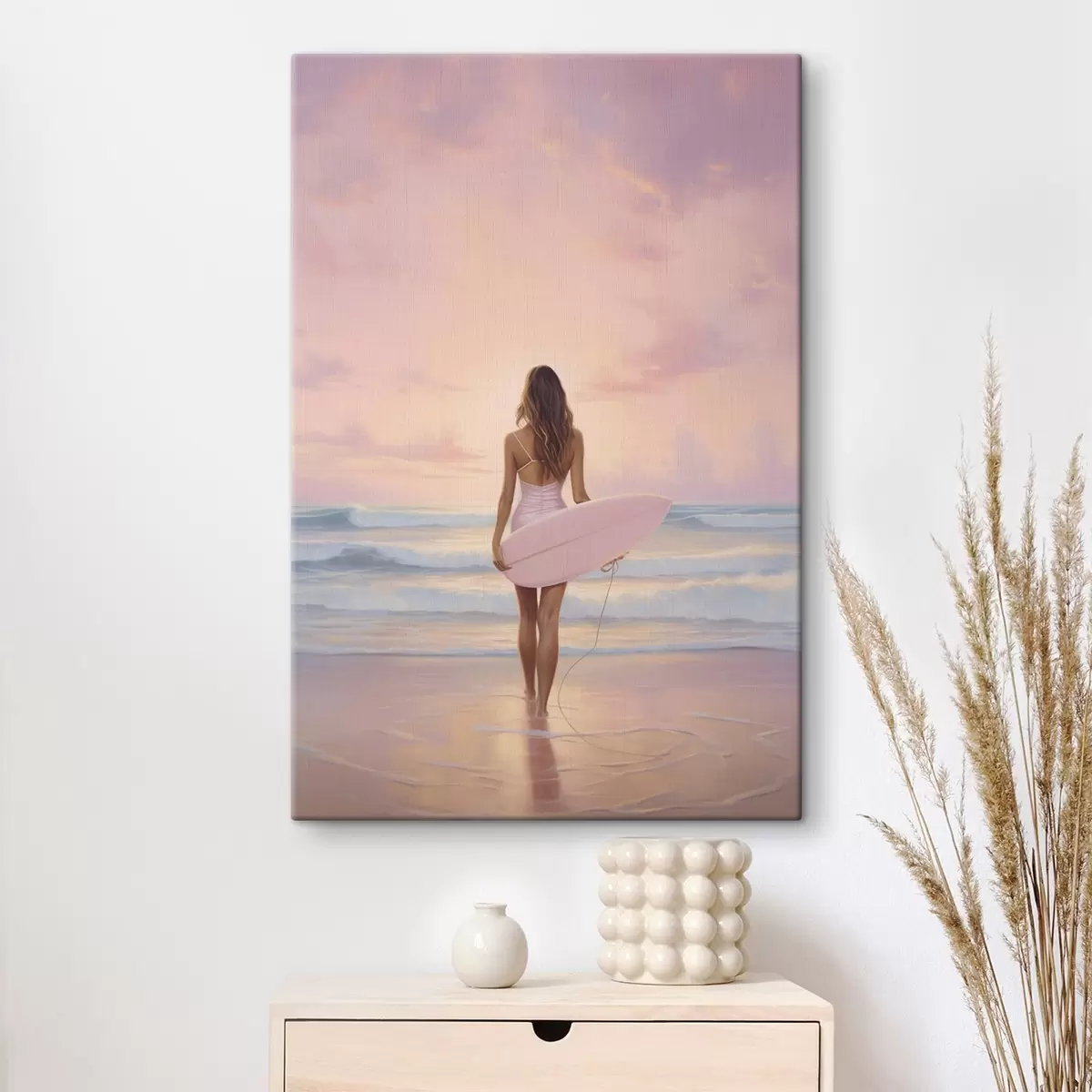 Schilderijen Meisje met surfplank op het strand van de oceaan, zonsondergang, tekening in acrylstijl s43881