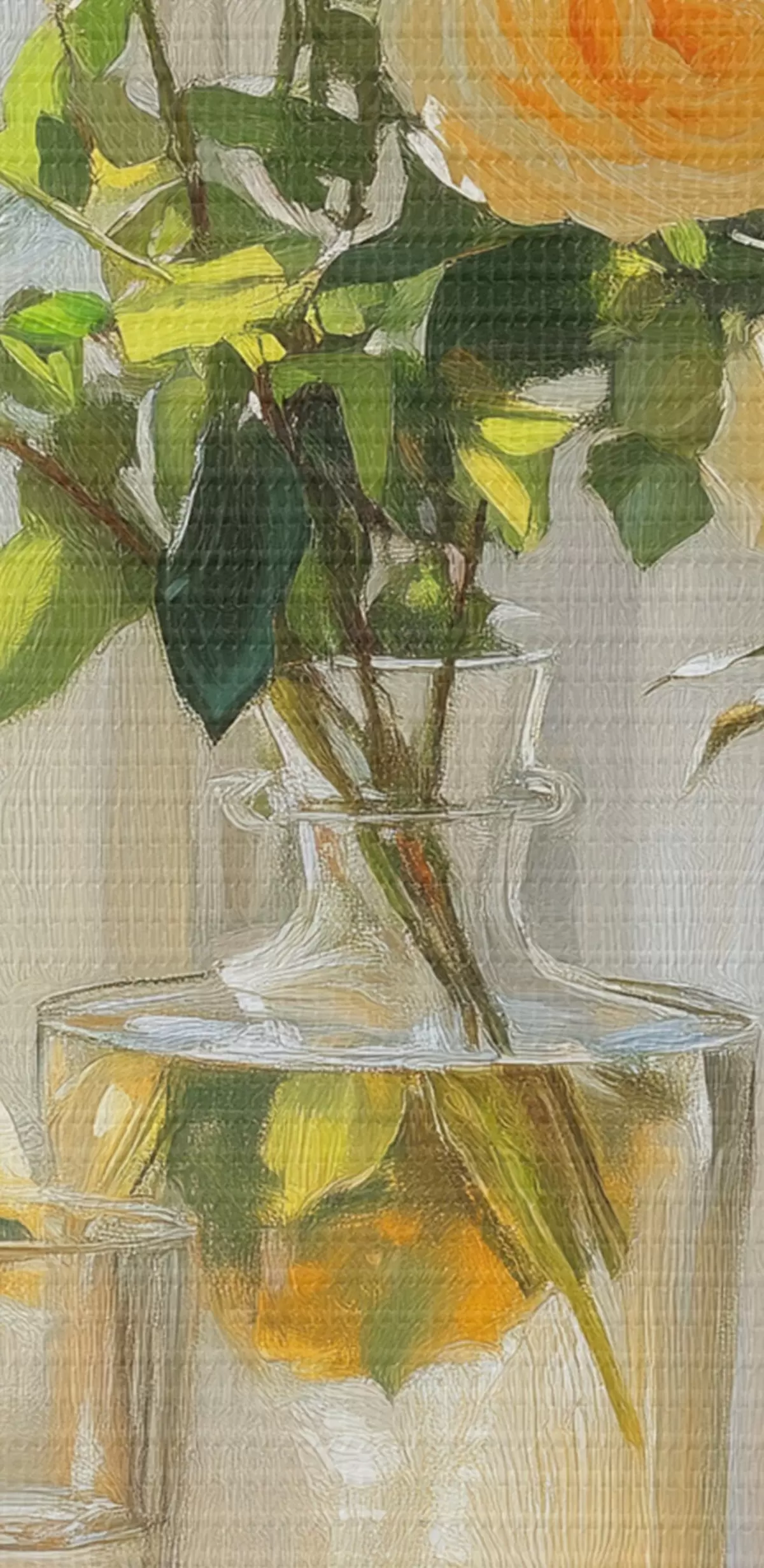 Schilderij Rozen in vazen, tekening in olieverfstijl, zacht zonlicht, citroenen, lente Art. s43887