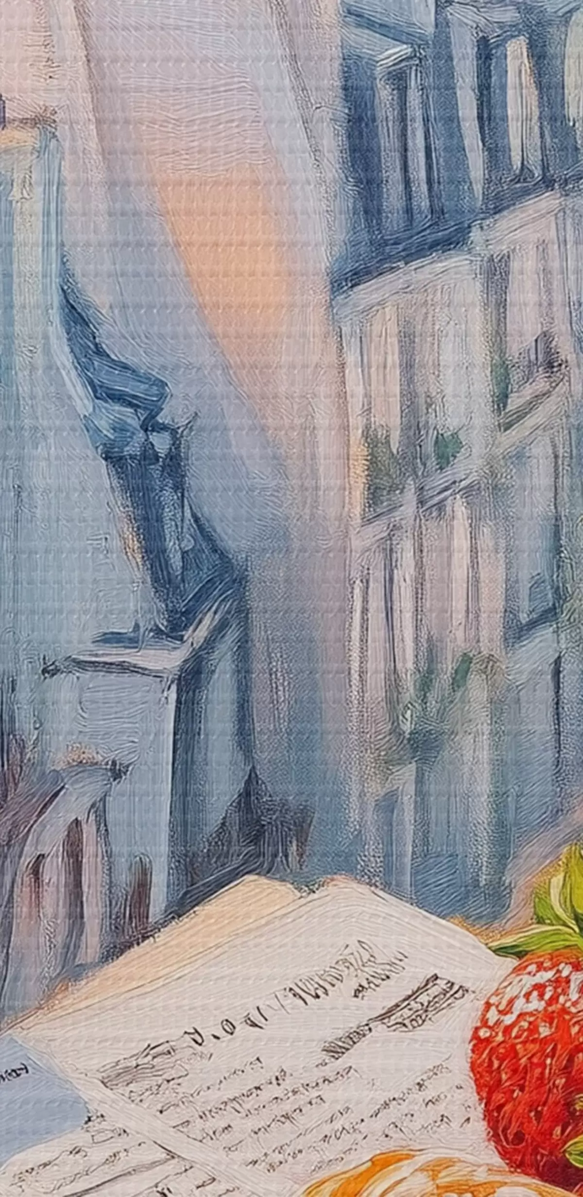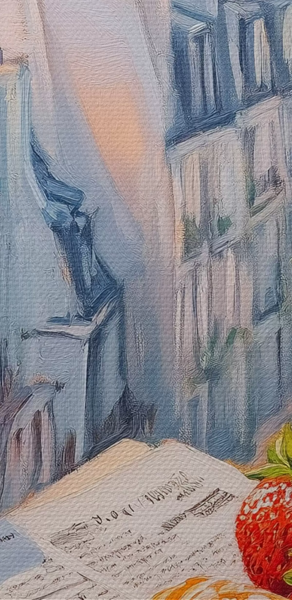 Schilderij Zonsopgang op het balkon in Parijs, Eiffeltoren, aardbeien, koffie, dagboek Art. s43890