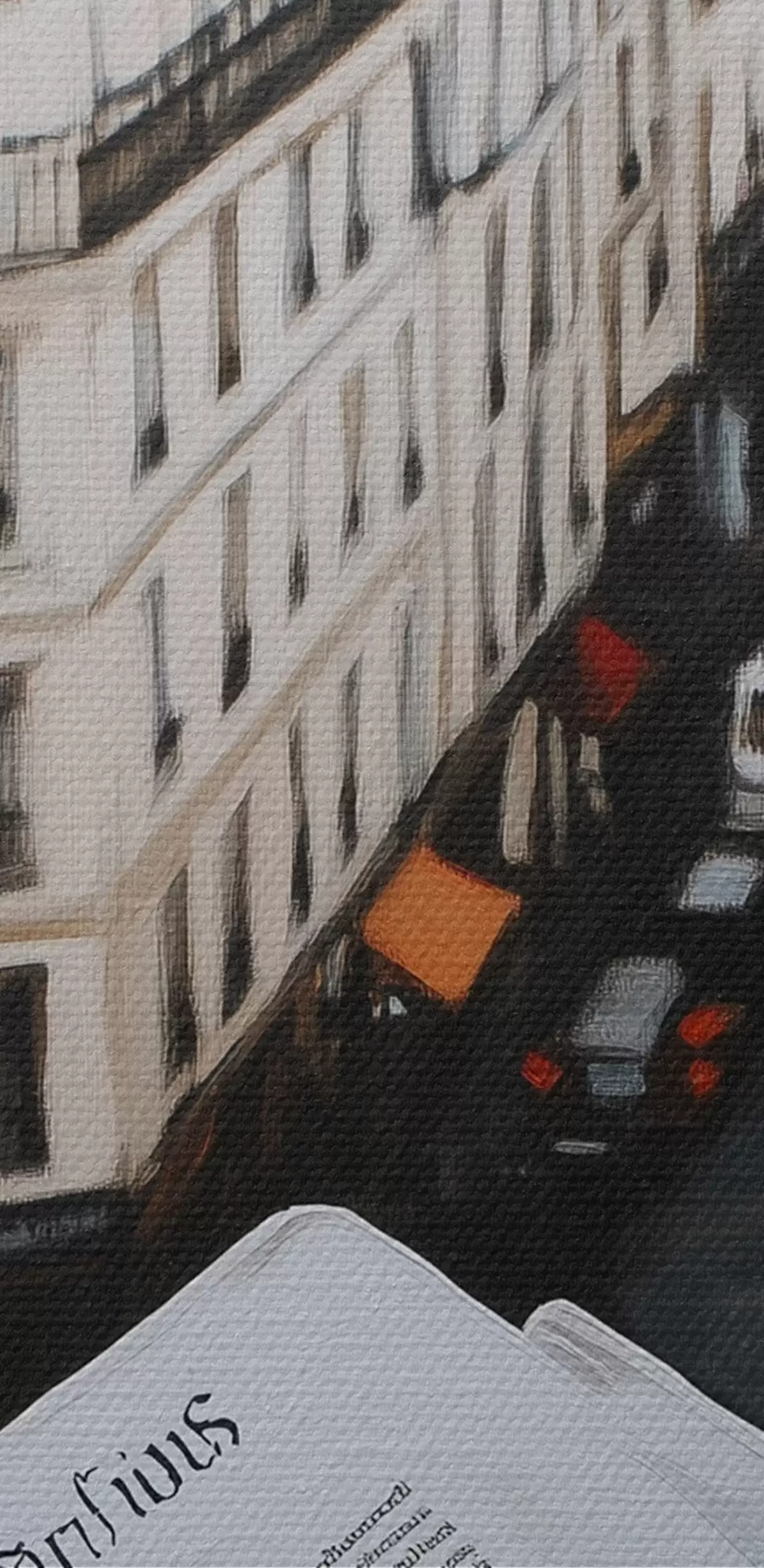 Schilderijen Ochtendkoffie met croissants, stadsstraat, architectuur, olieverfstijl s43891