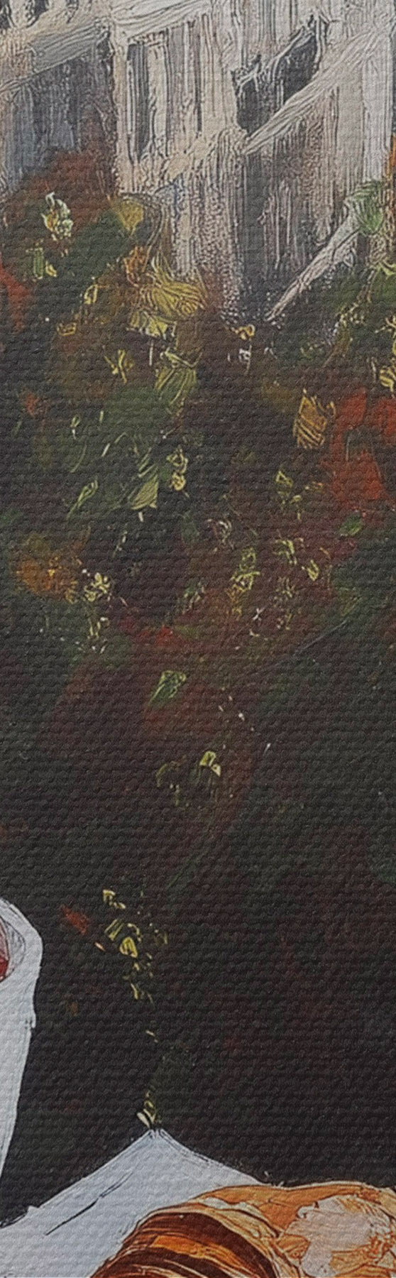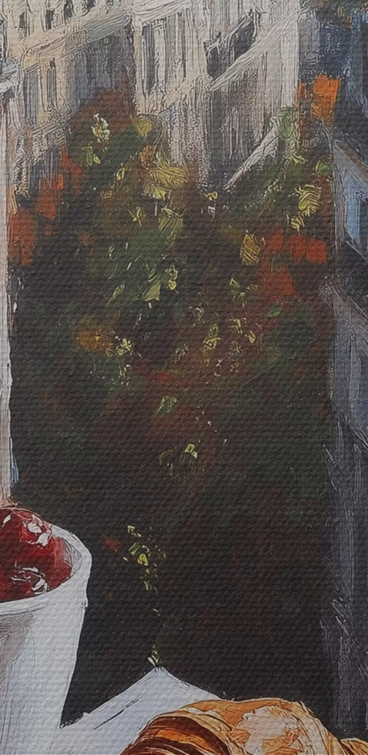 Schilderij Ochtend in Parijs, koffie met croissants, stadsgezicht, olieverf tekening Art. s43892