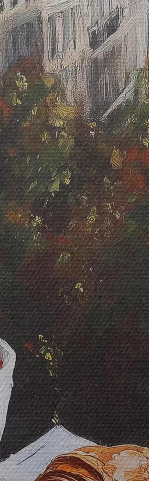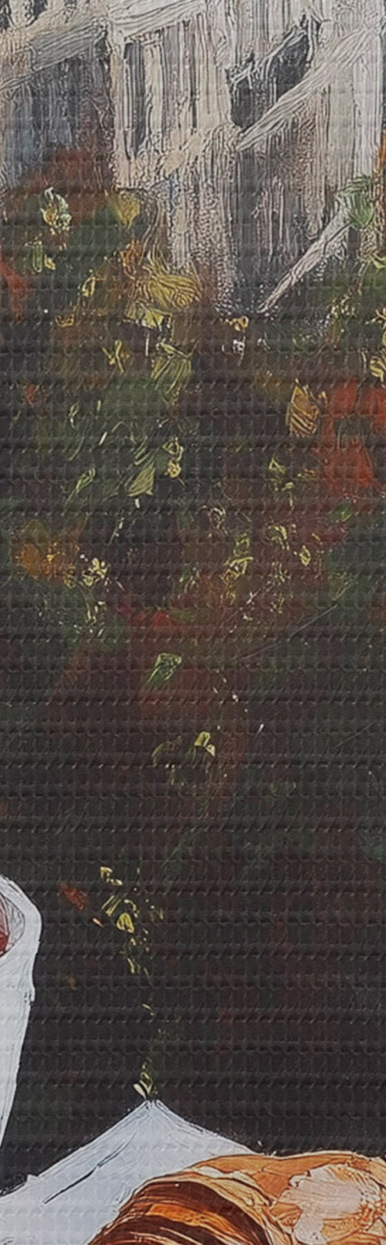 Het schilderij kan voorzichtig worden schoongeveegd met een droge zachte doek of spons; het wordt niet aanbevolen om natte producten te gebruiken. Het gebruik van een vochtige spons is alleen toegestaan als het schilderij gevernist is.