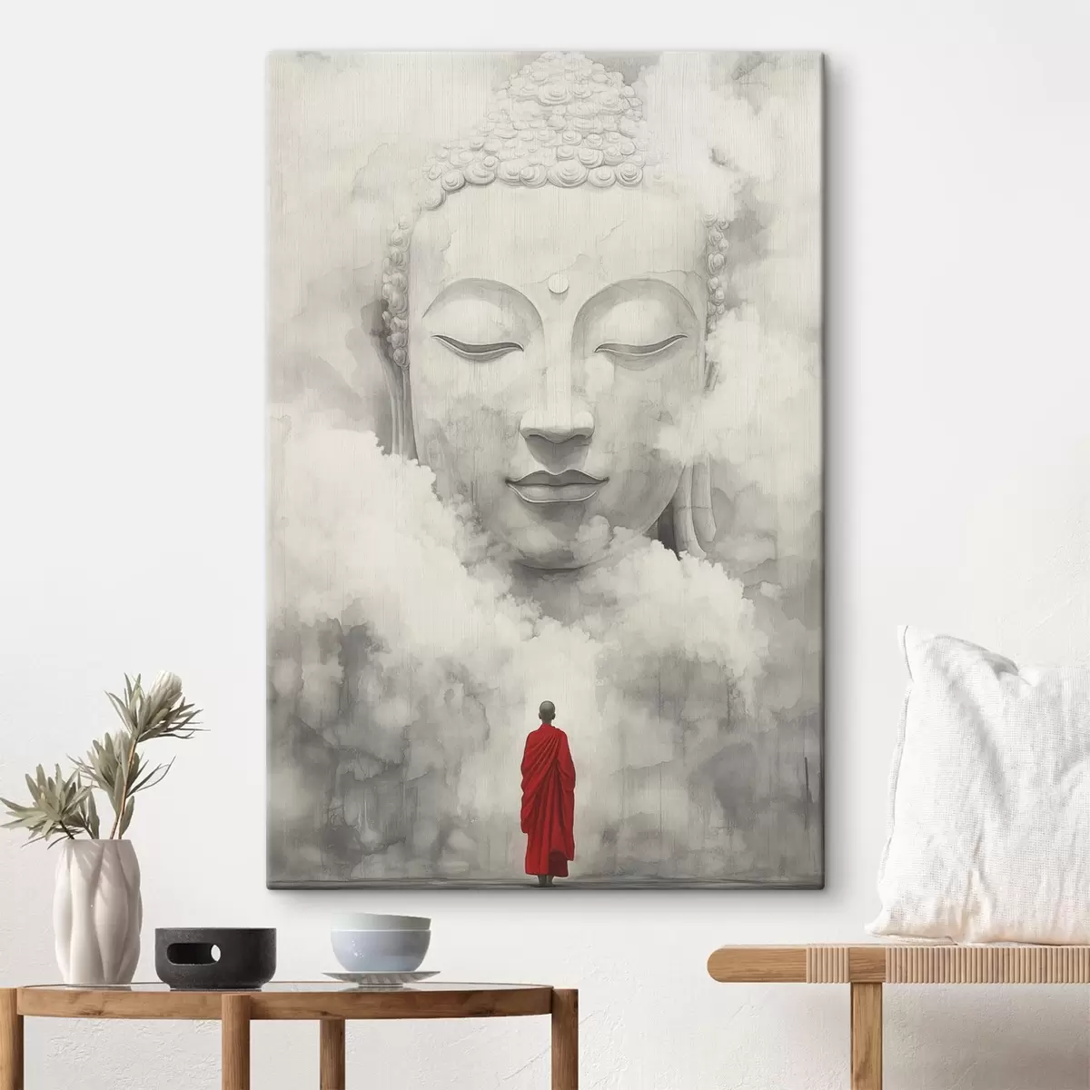 Schilderij Boeddhisme, monnik in het rode gewaad, mist, aquarel stijl Art. s44007