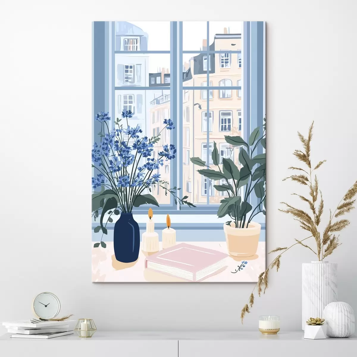 Schilderij Gezellig huis met bloemen en uitzicht op het raam, architectuur, blauwe kleuren Art. s44010
