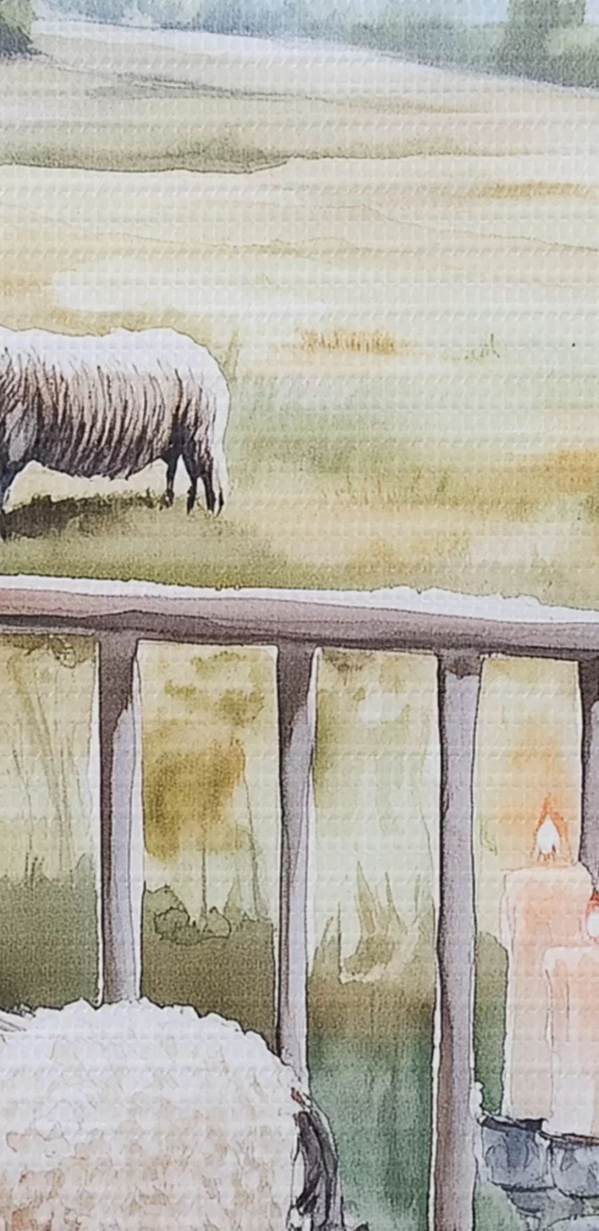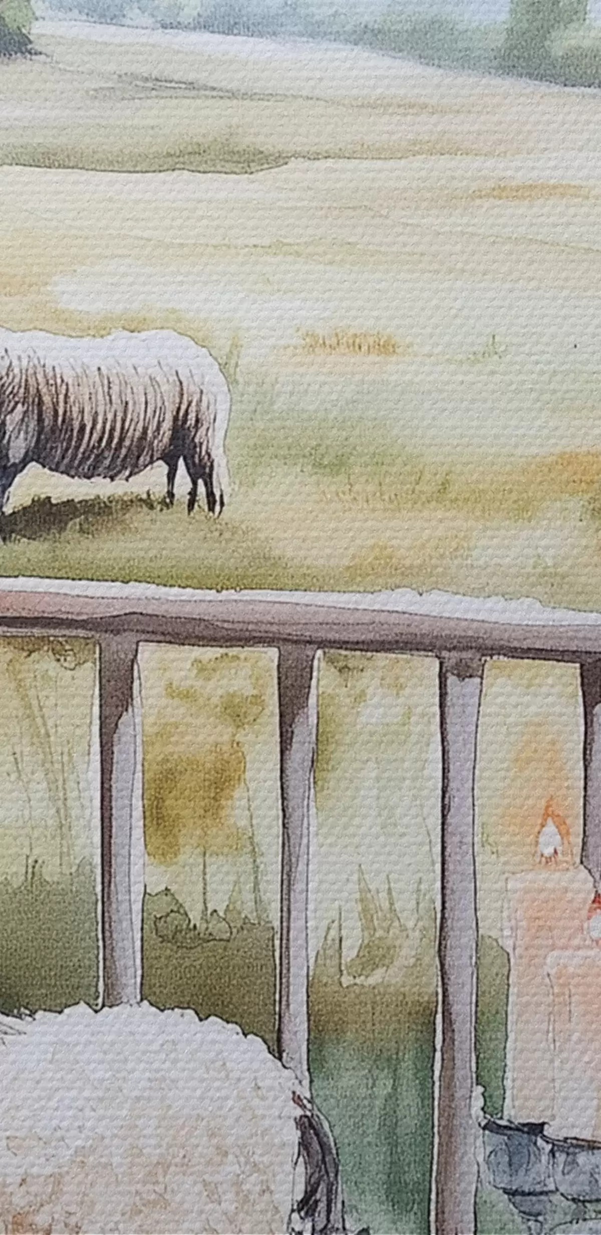 Schilderij Plattelandsboerderij met schapen, velden, rustieke bloemen, aquarelstijl Art. s44014