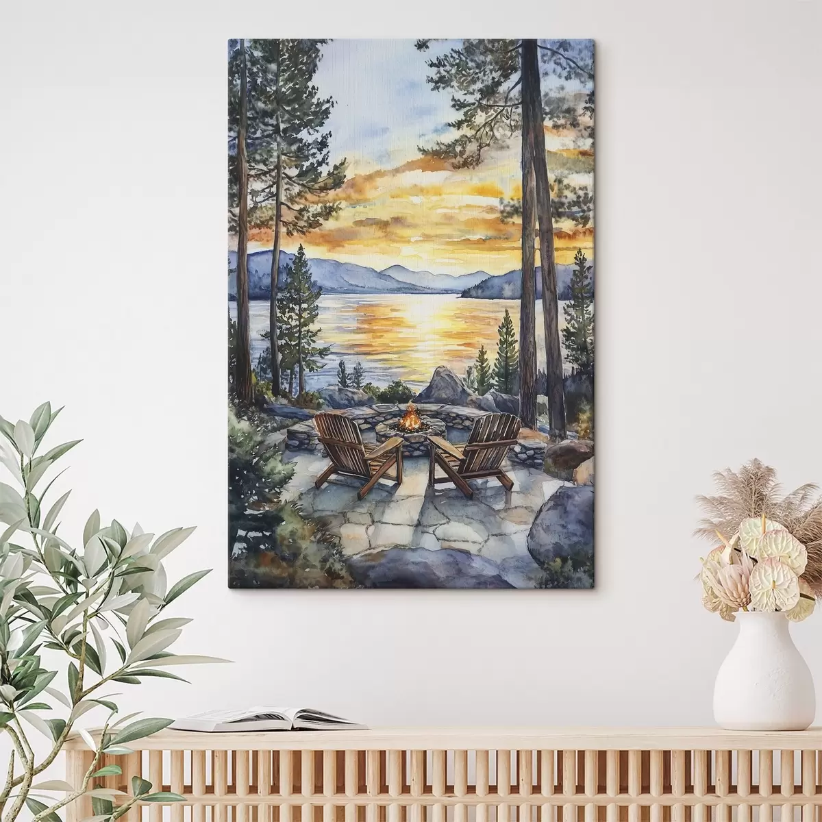 Schilderij Meer met bergen op de zonsondergang, reizen, gezellige open haard, aquarel Art. s44018