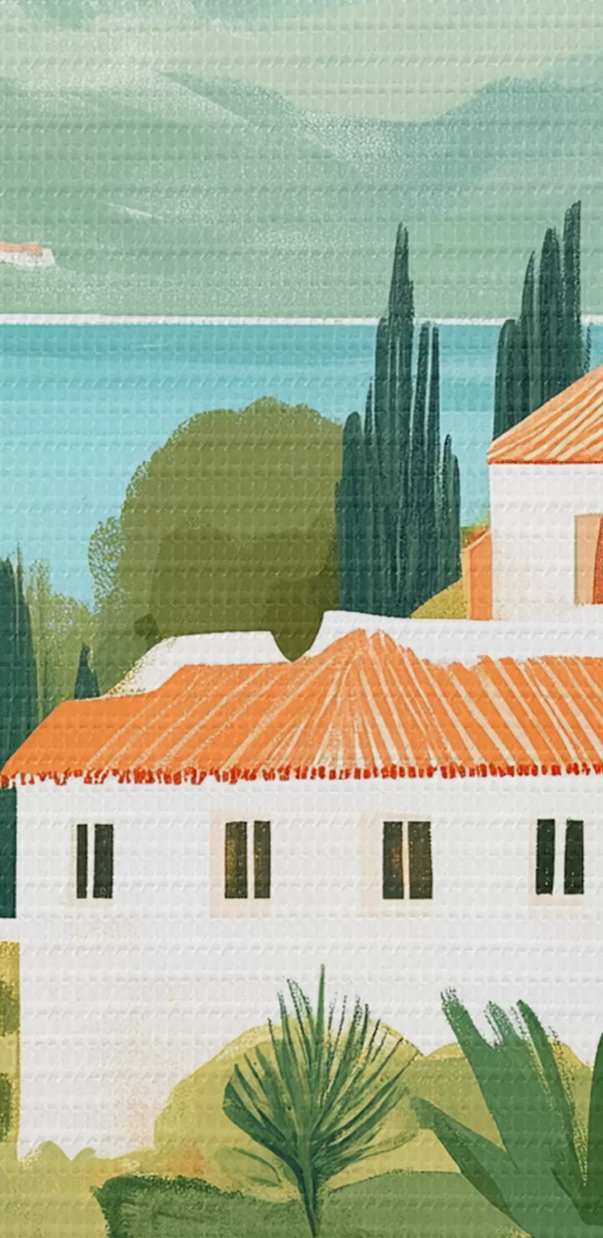 Schilderij Mediterraan landschap met sinaasappelbomen en huizen, zeekust Art. s44027