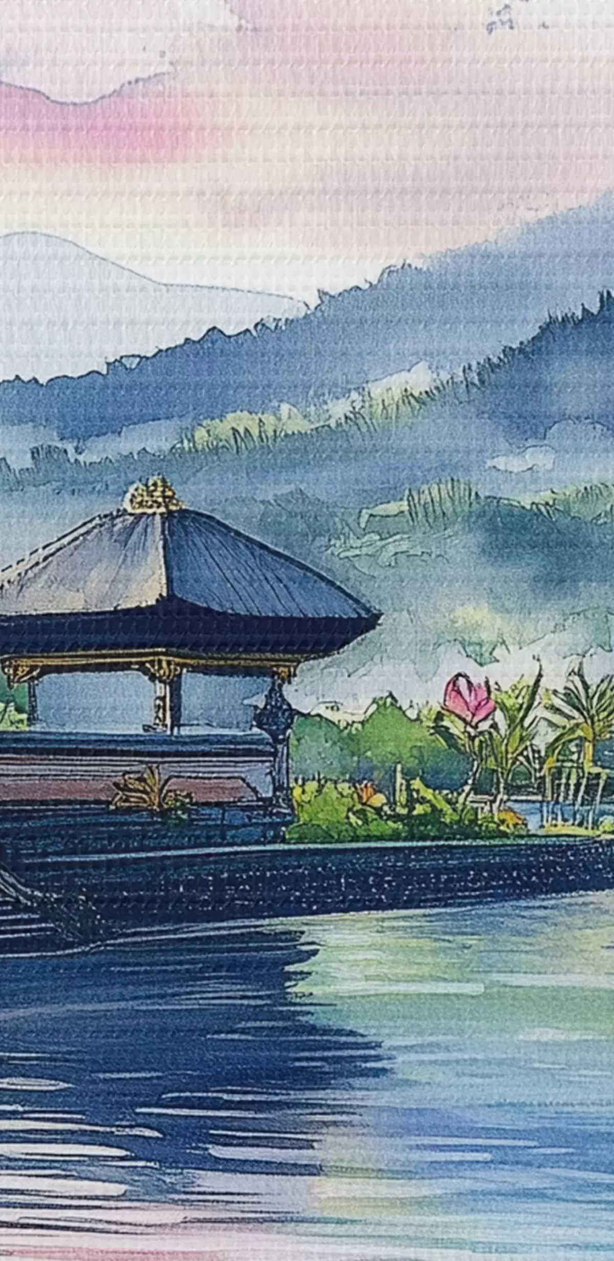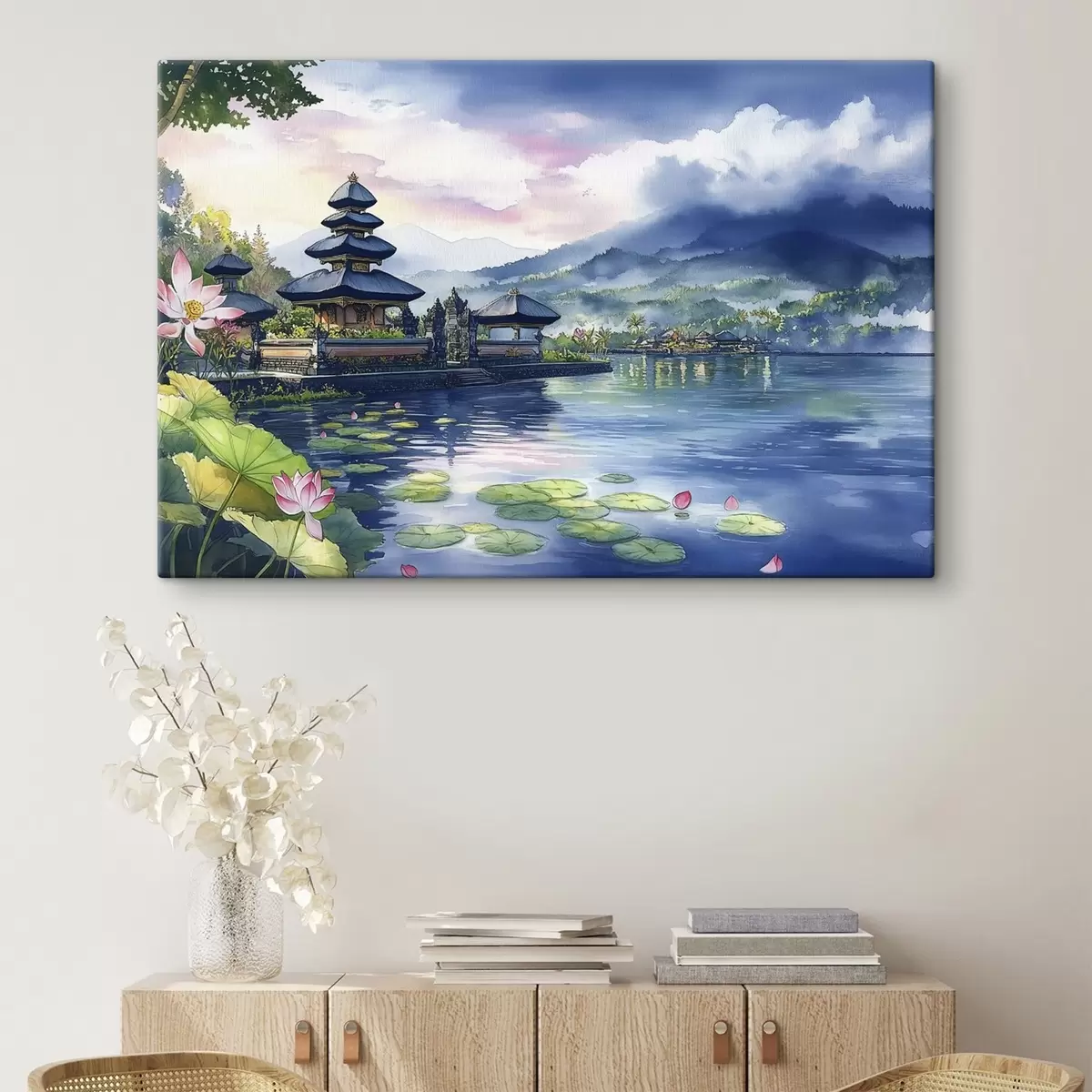 Schilderijen Indonesisch eiland, tempel, boeddhisme, tropische natuur, aquarelstijl s44148