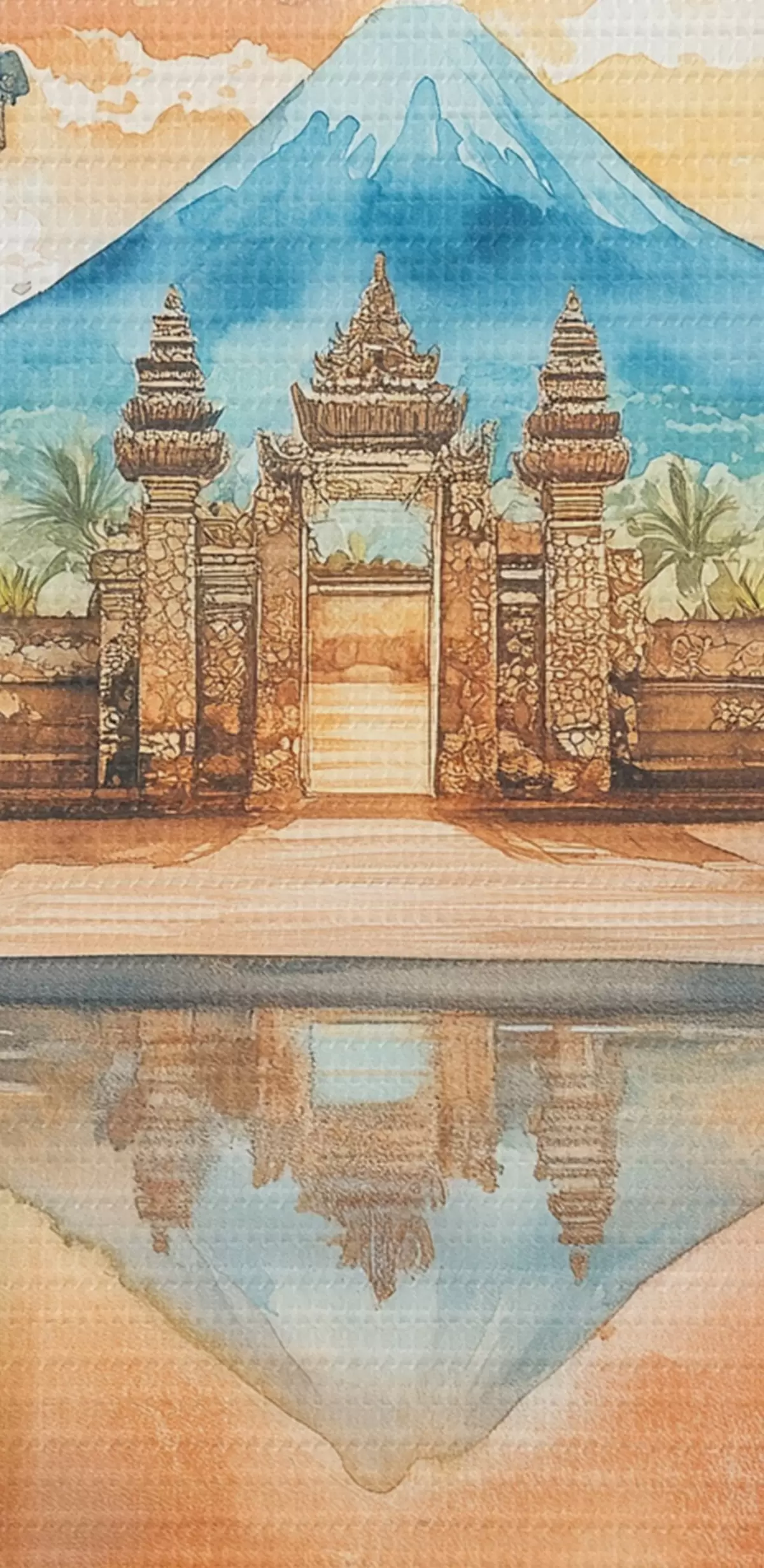 Schilderijen Bali esthetiek, tempel, zonsondergang, tropische natuur, aquarel stijl s44149