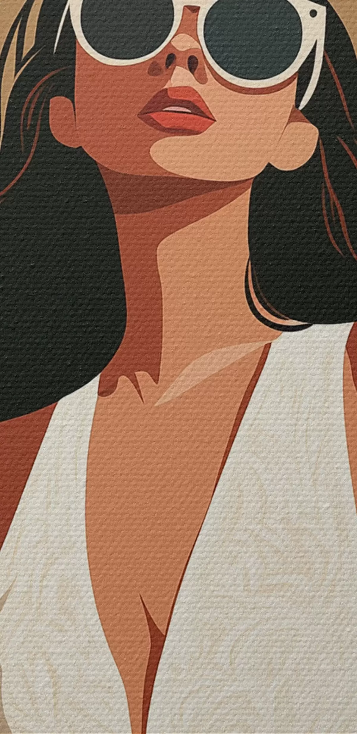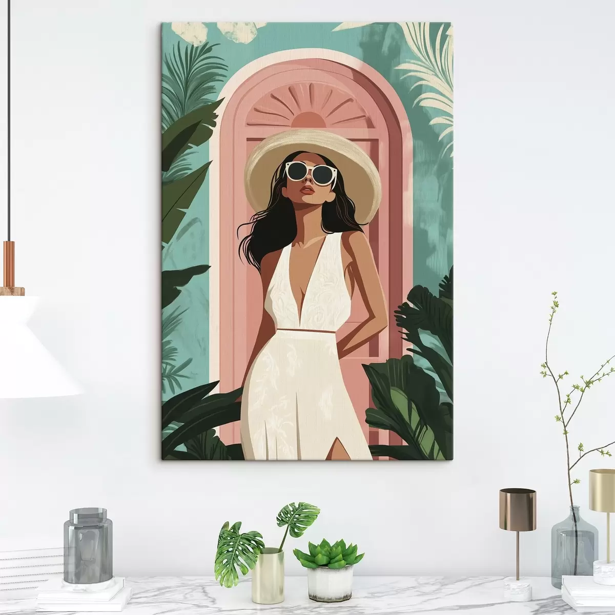 Schilderij Vrouw met zonnebril en hoed, tropische natuur, architectuur Art. s44152