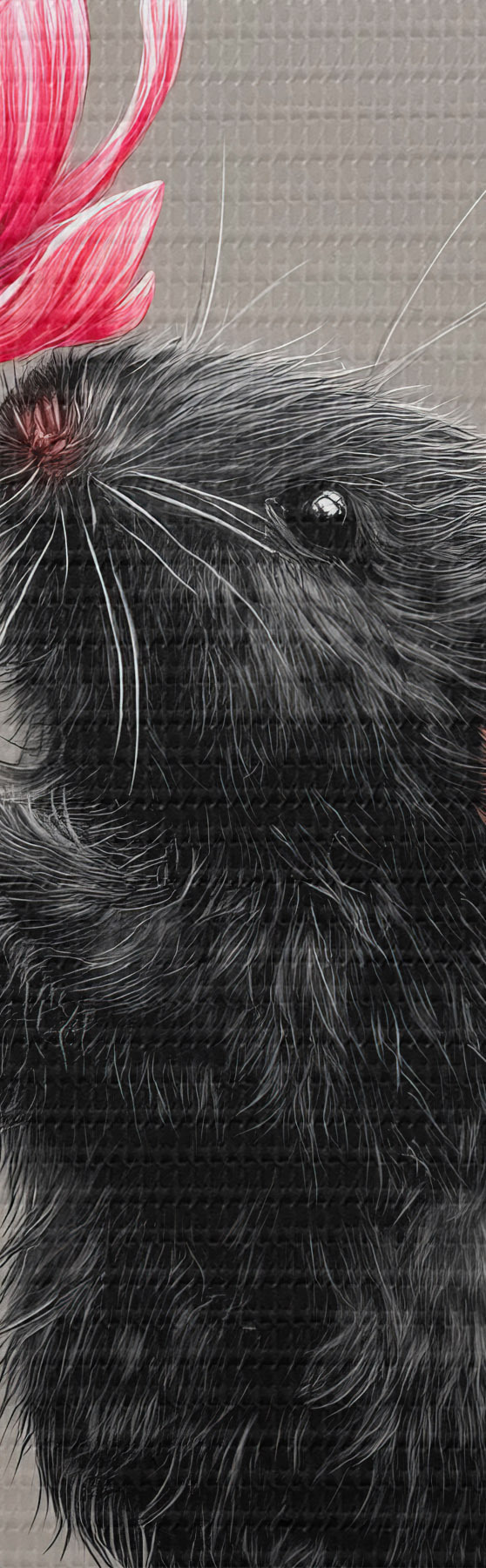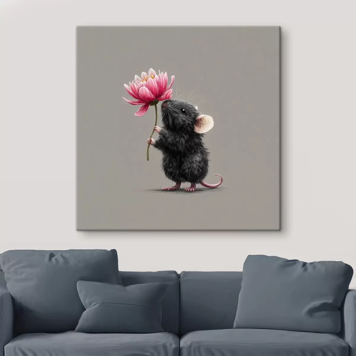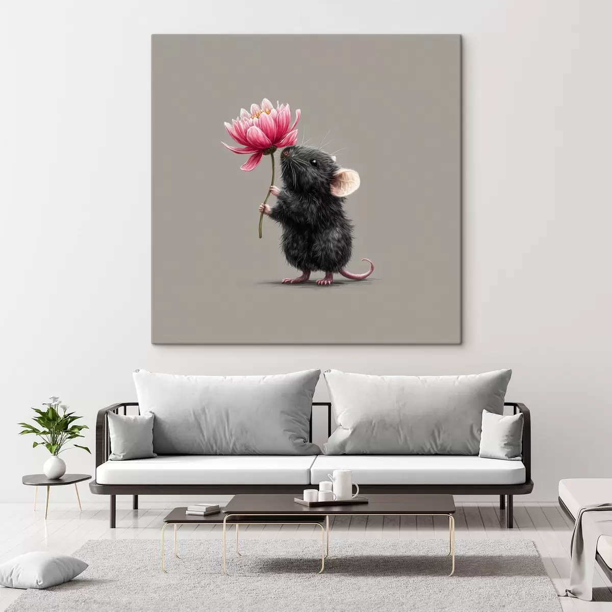 Schilderij Charmante muis inhaleert de geur van een roze pioenroos Art. s44248