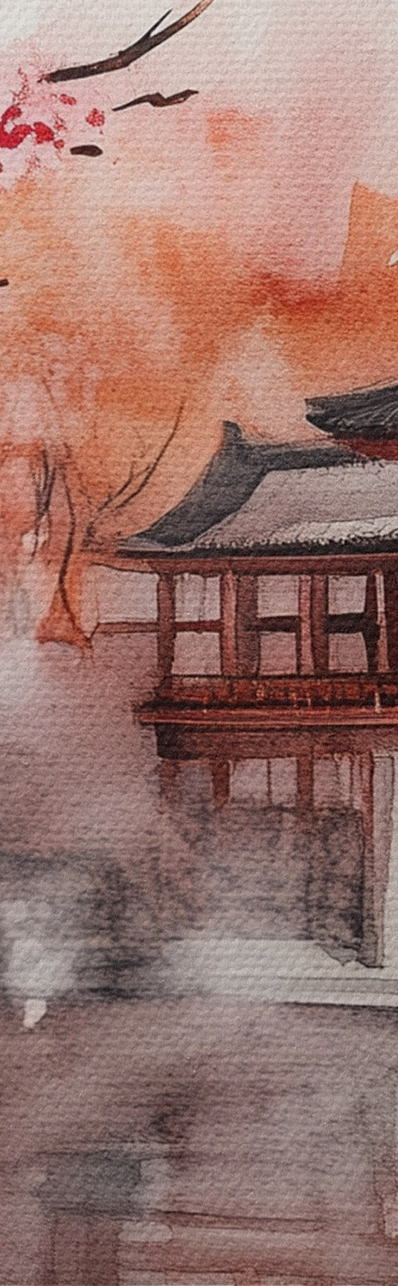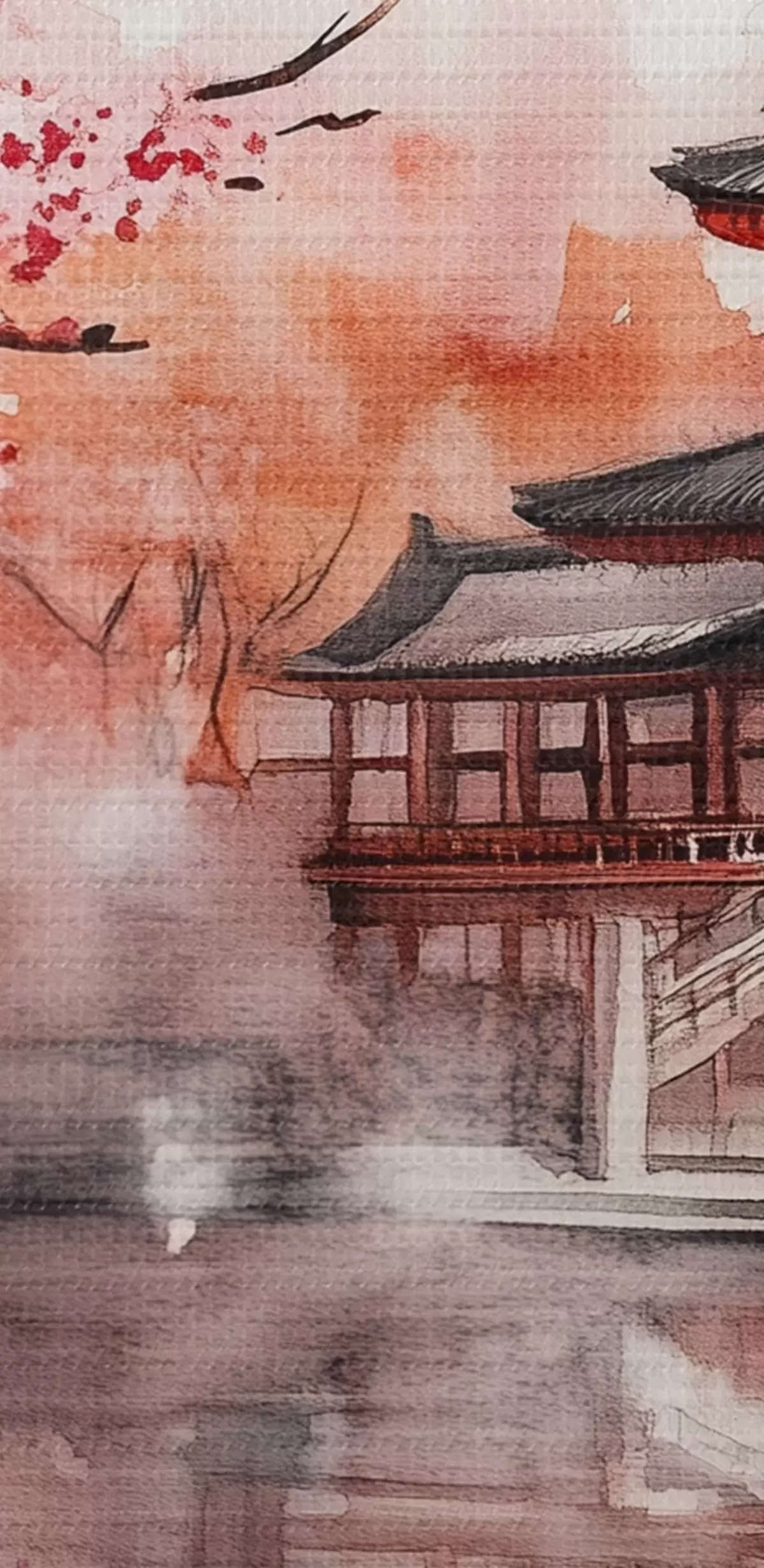 Schilderij Prachtig Japans landschap met bloeiende kersenboom en huis aan het meer Art. s44310