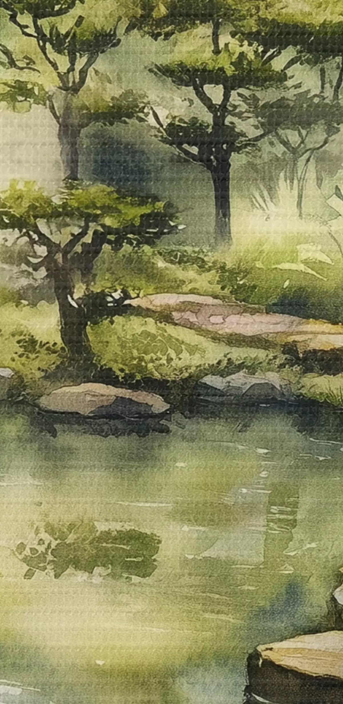 Schilderij Oosters bos met rotsen, vijver en pijnbomen, groen, aquarelstijl Art. s44311