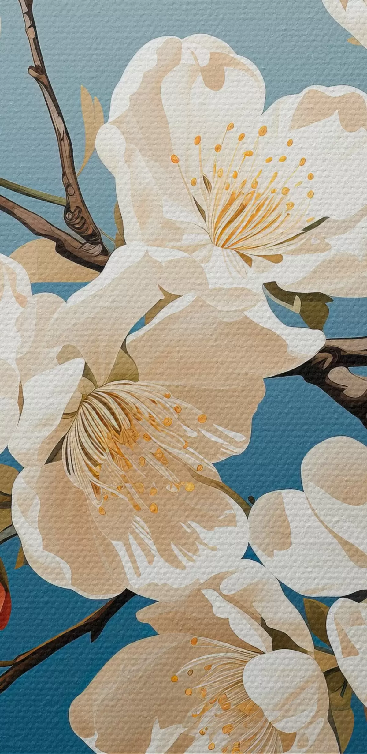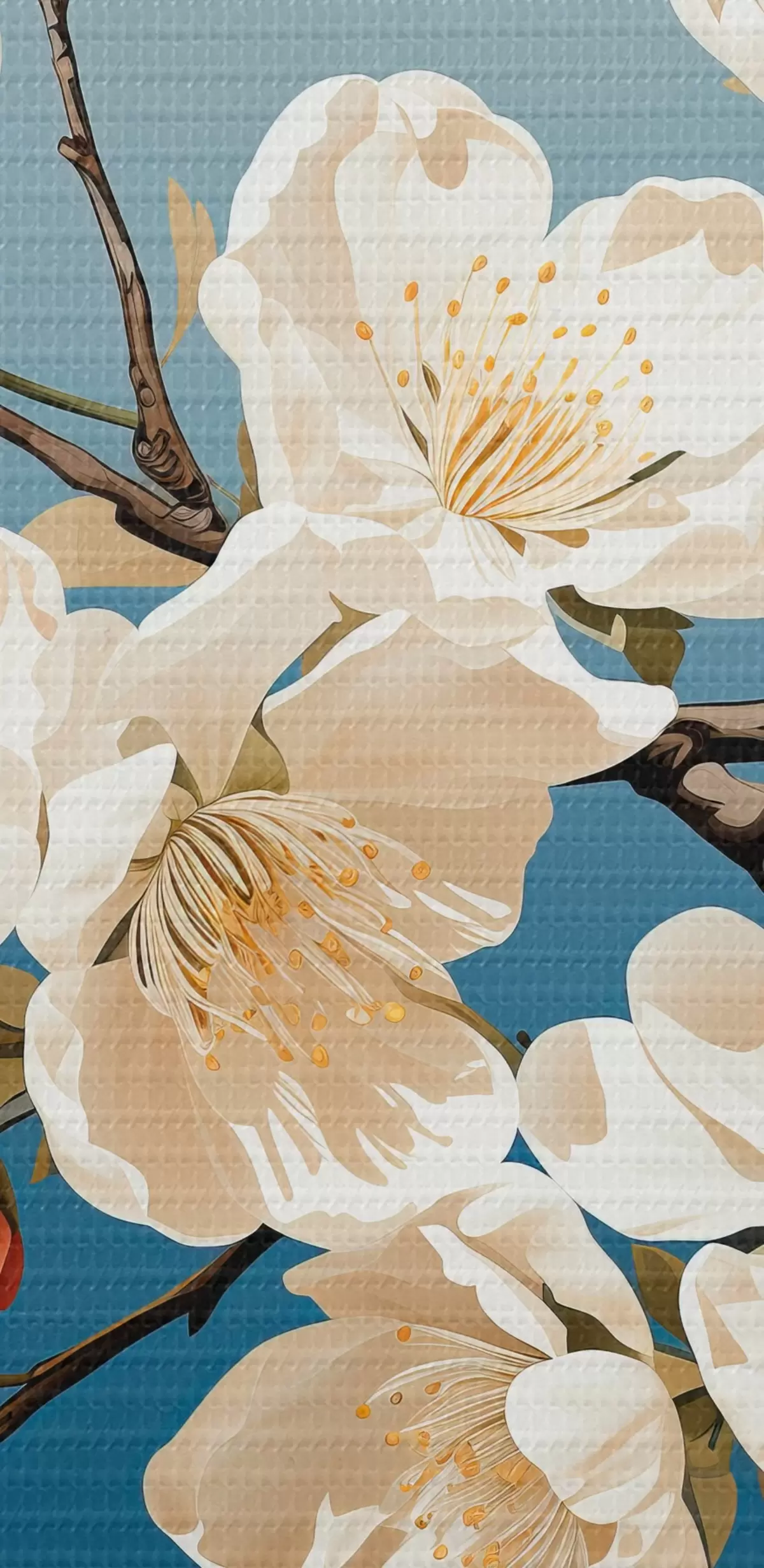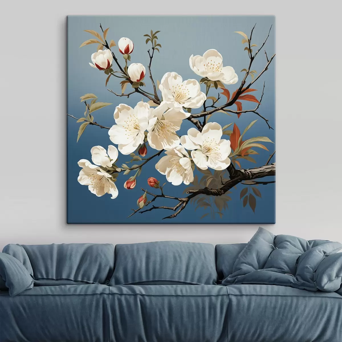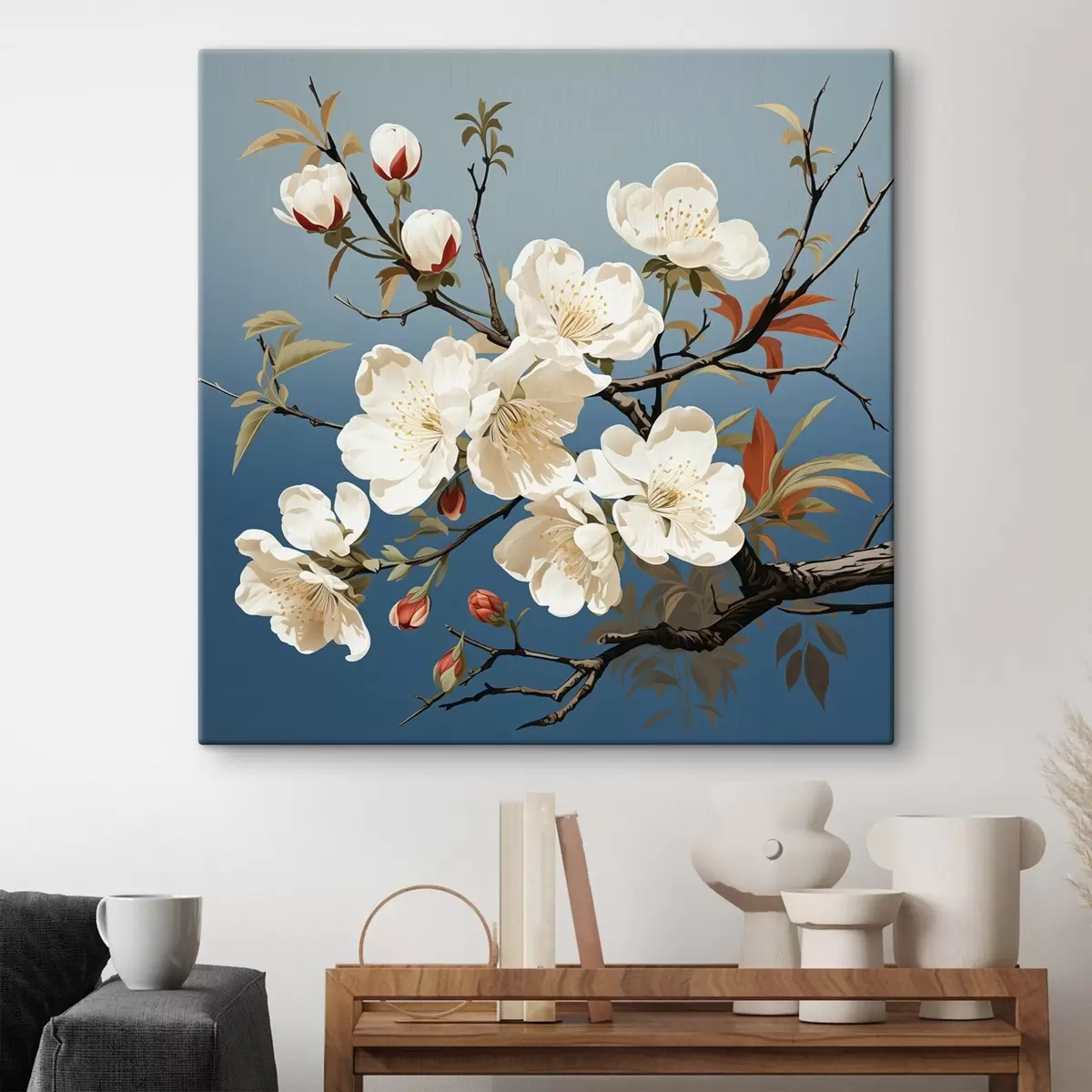 Schilderij Magnolia tak met roodachtige knoppen op een blauwe achtergrond Art. s44341
