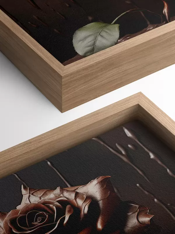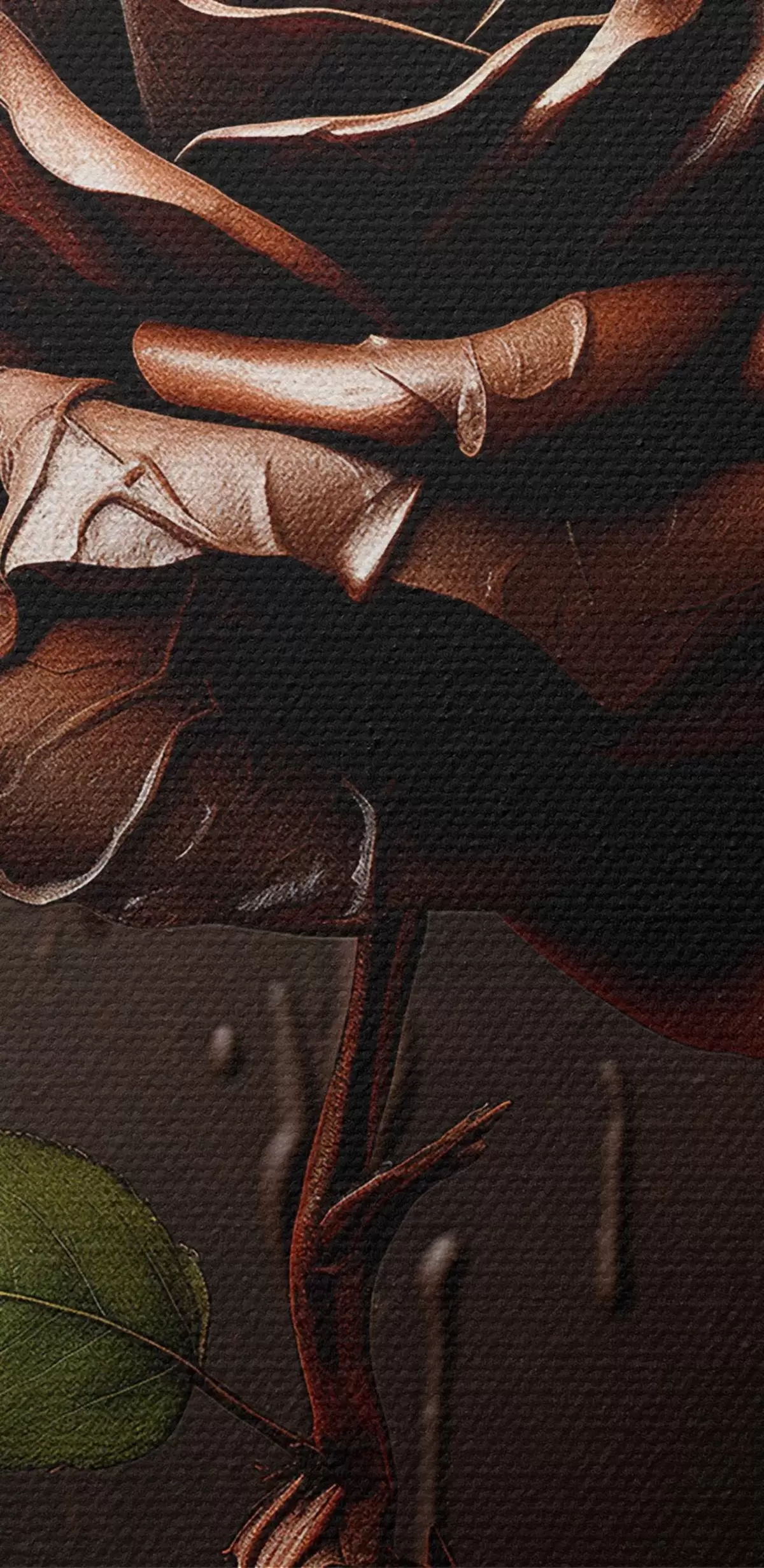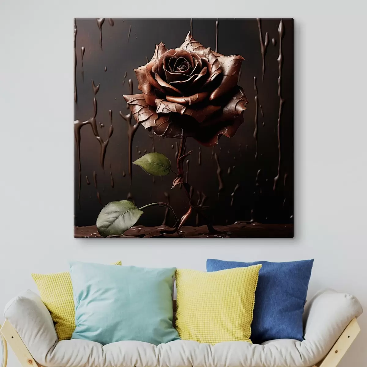 Schilderij Bruine roos op een donkere achtergrond met chocolade spetters Art. s44381