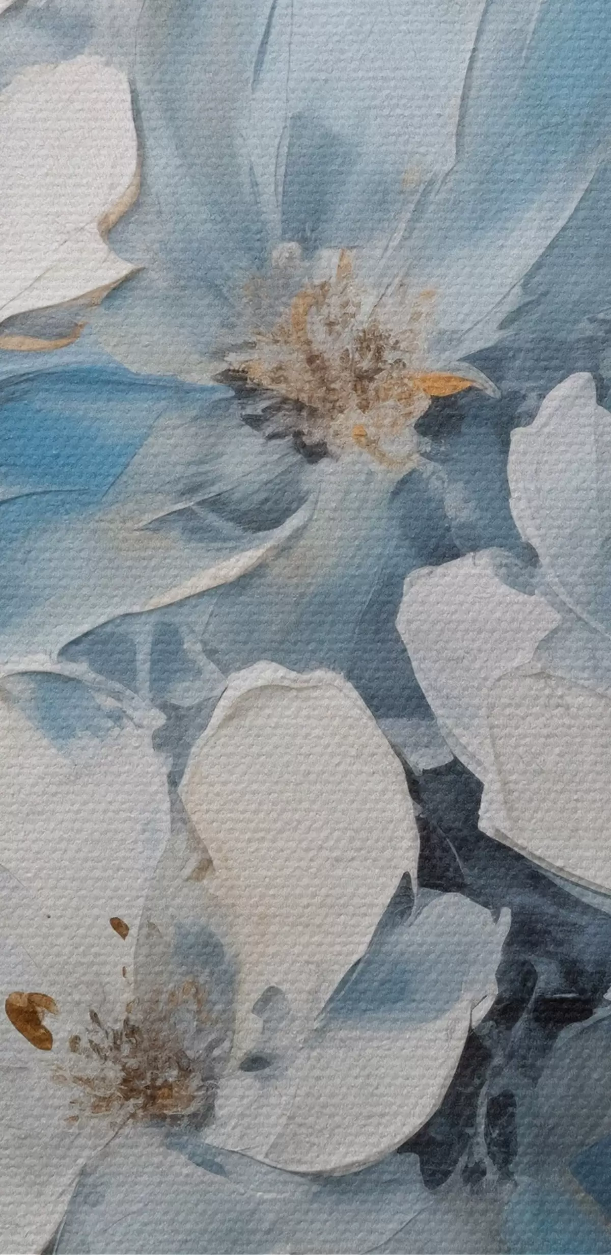 Schilderij Witte bloemen met blauwe bladeren, op een lichtbeige achtergrond, met zichtbare penseelstreken Art. s44395