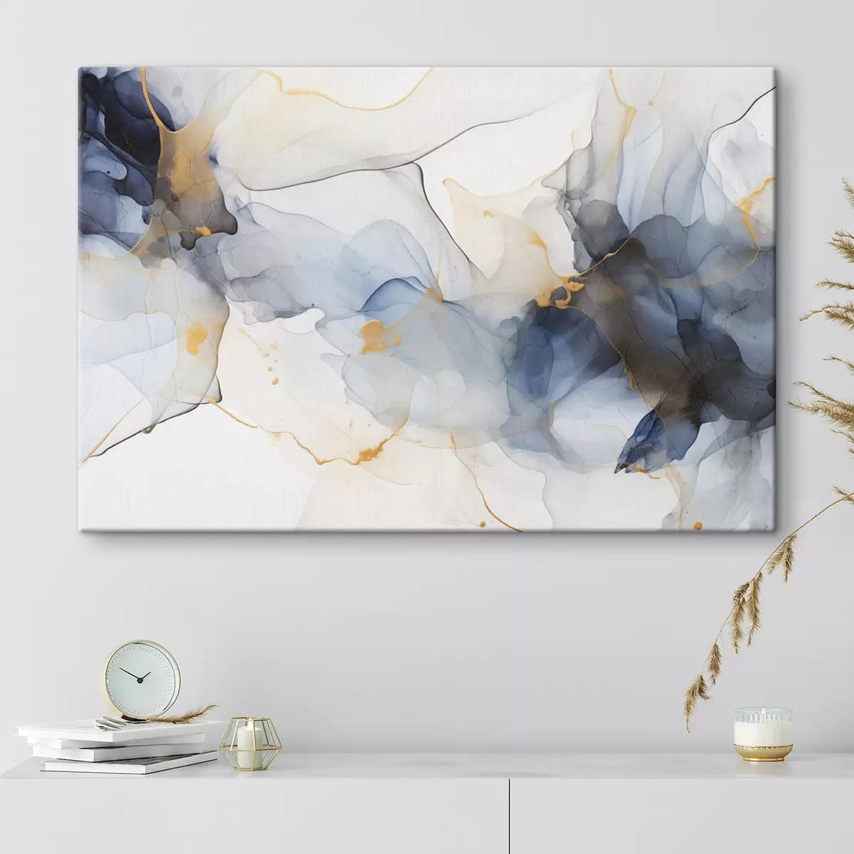 Schilderij Abstract schilderij met blauwe inkt, vloeiende en organische vormen, delicate texturen op een witte achtergrond Art. s44397