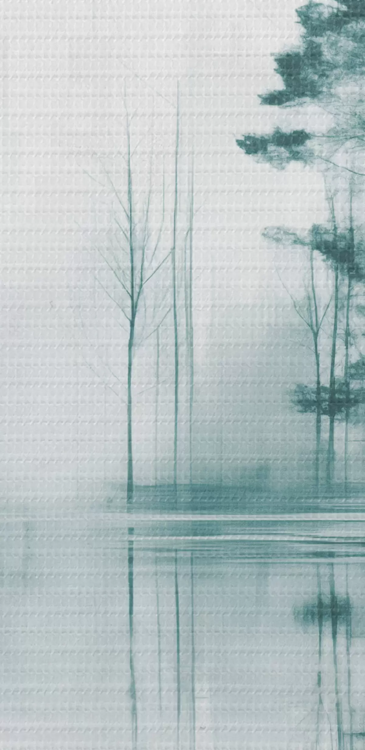 Schilderij Abstract bos met hoge bomen weerspiegeld in het water, gedempt kleurenpalet Art. s44403