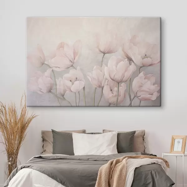 Schilderij Vintage roze tulpen met lange stelen, zachte gedempte kleuren, lichtgrijze achtergrond Art. s44407
