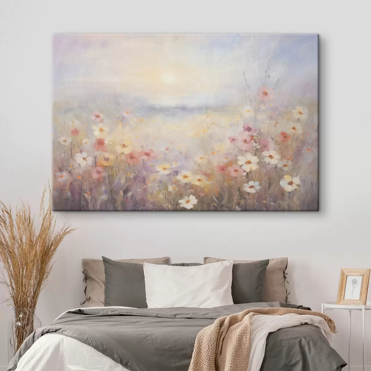 Schilderij Gestructureerd zonnig landschap van bloemenveld, zachte pastelkleuren, dromerige sfeer Art. s44408