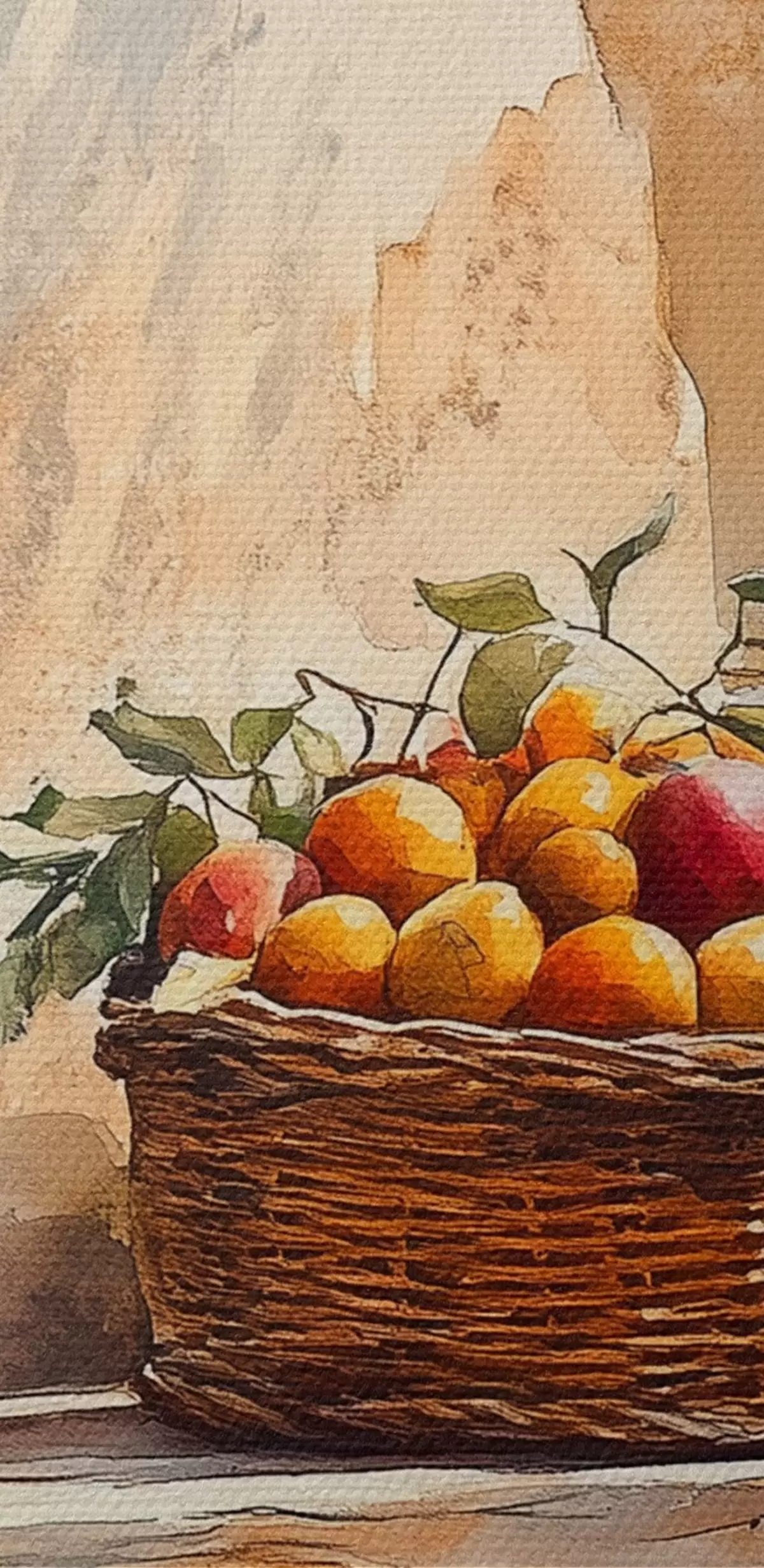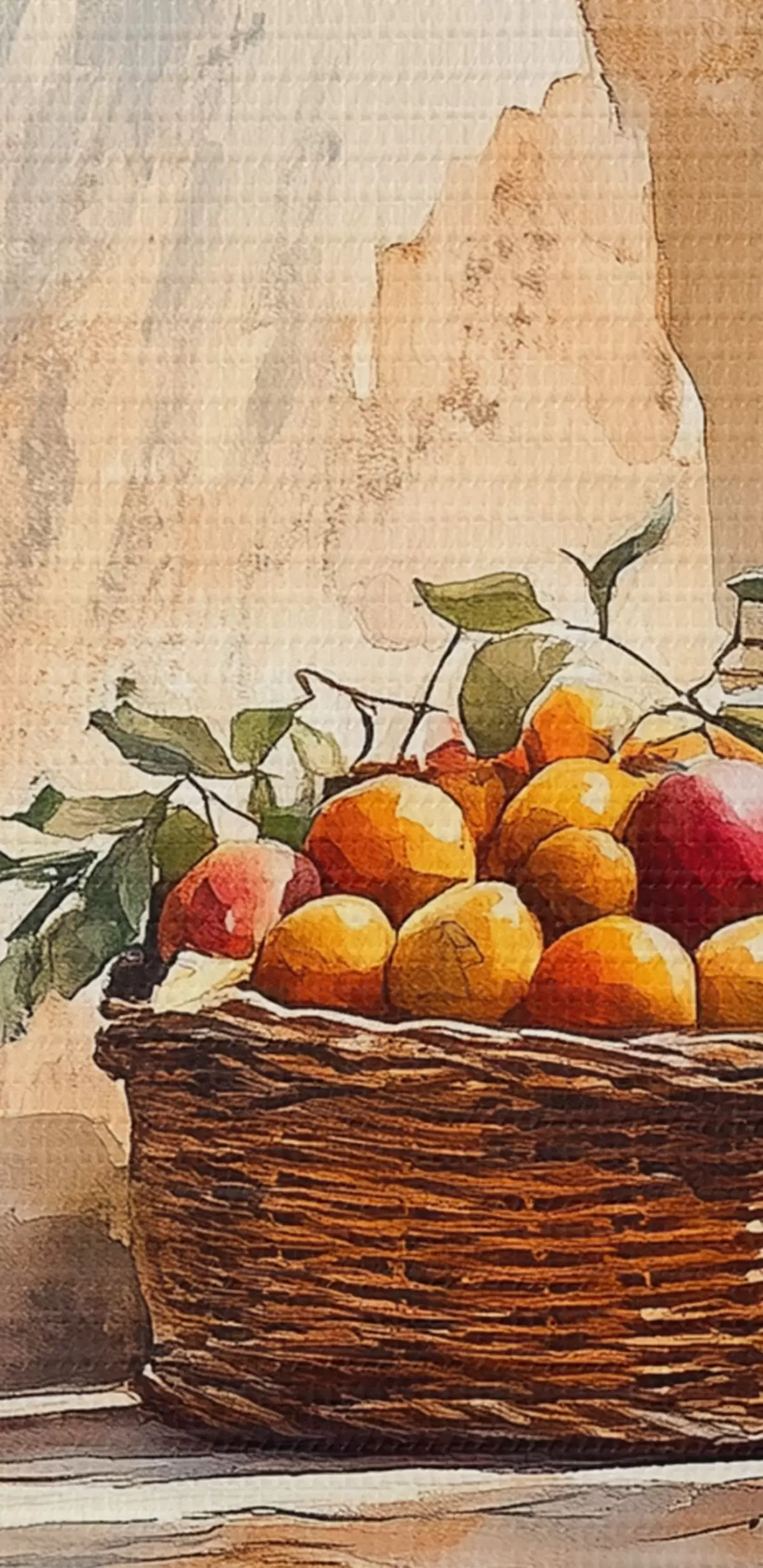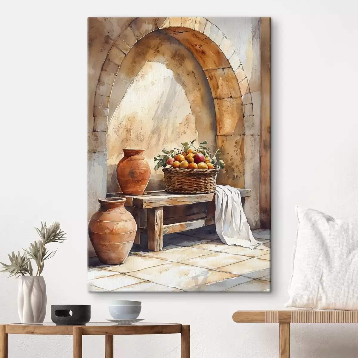 Schilderij Esthetische vazen en rieten mand met sinaasappels, Toscane, rustieke stijl Art. s44605