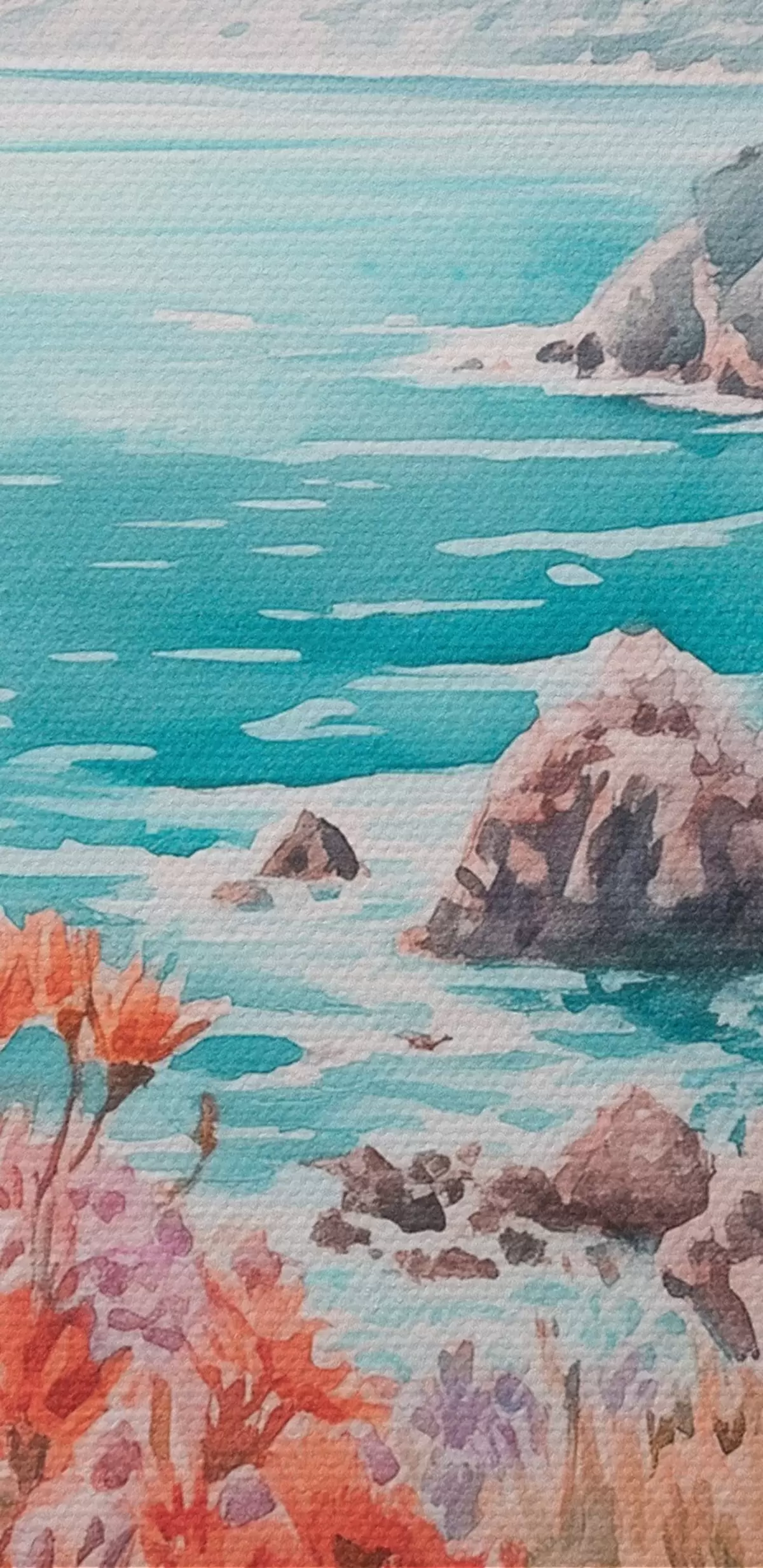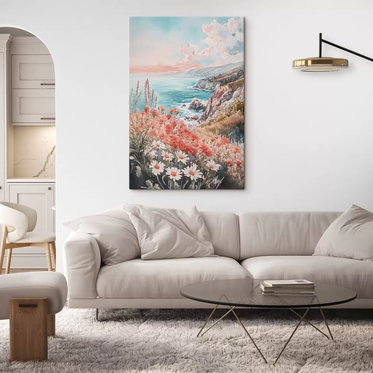 Schilderij Portugal oceaan kust op de zonsondergang, weide bloemen Art. s44612