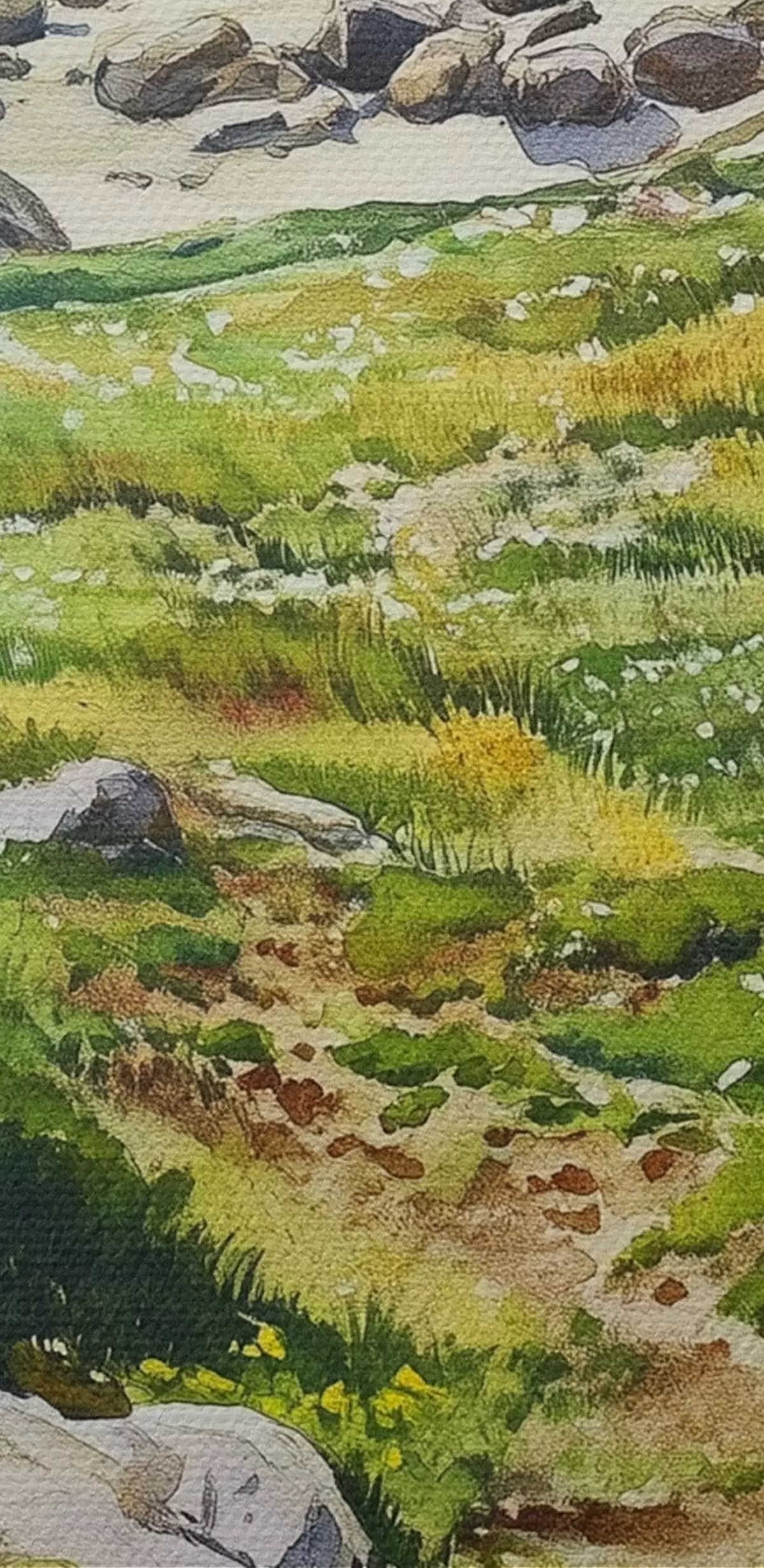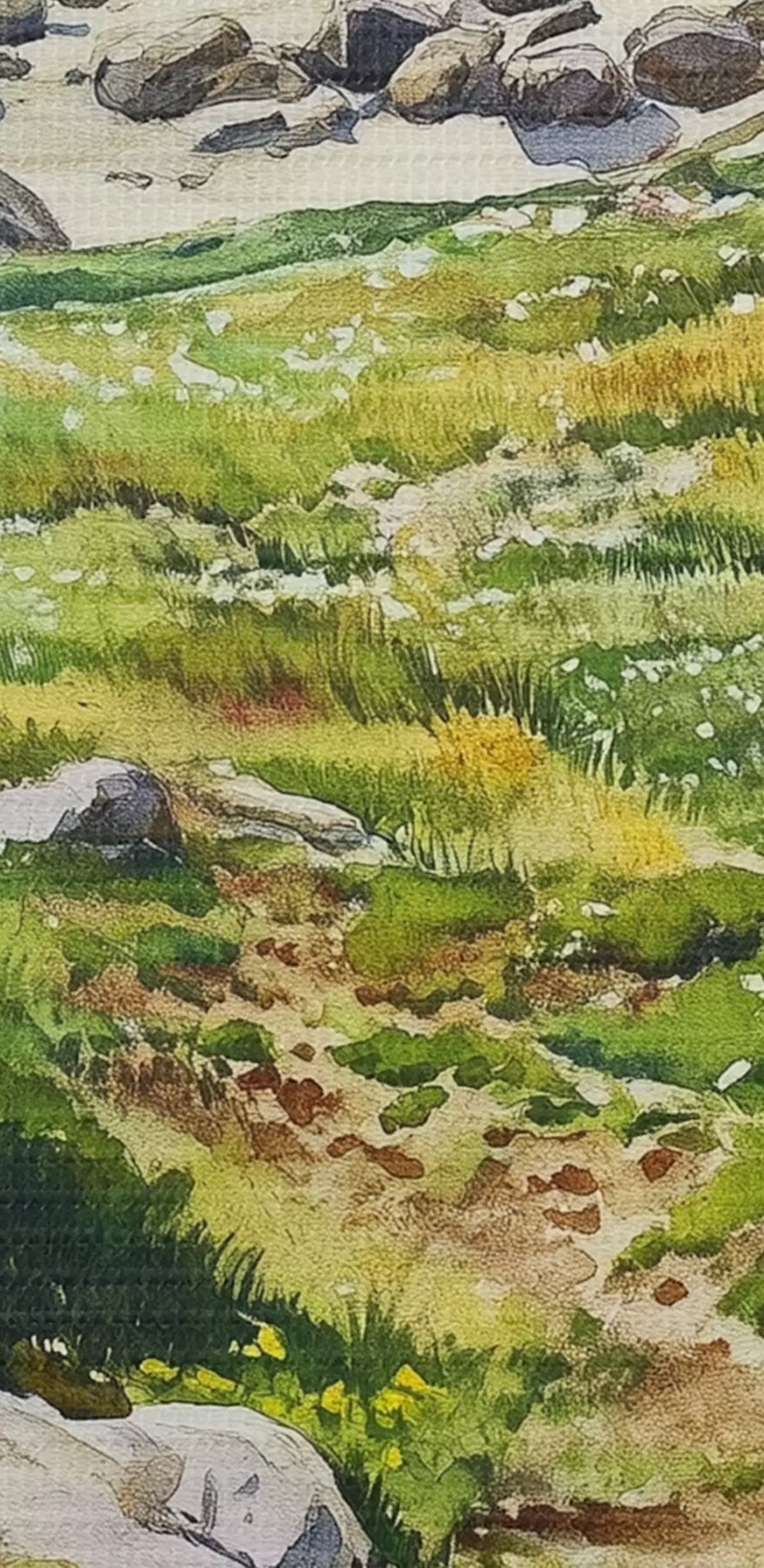 Schilderijen Zeekust met rotsen en groen gras, aquarel stijl, zomer s44616
