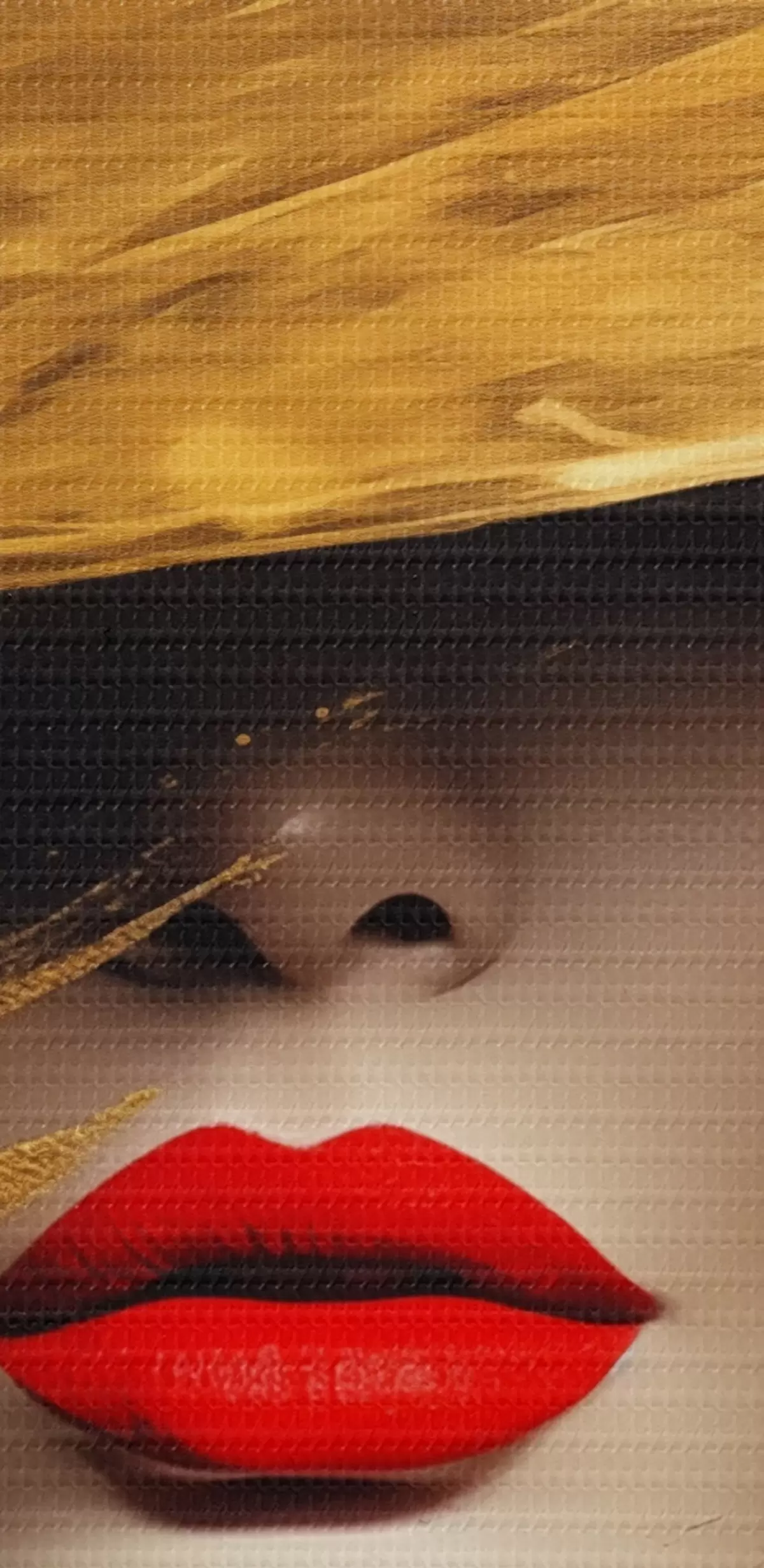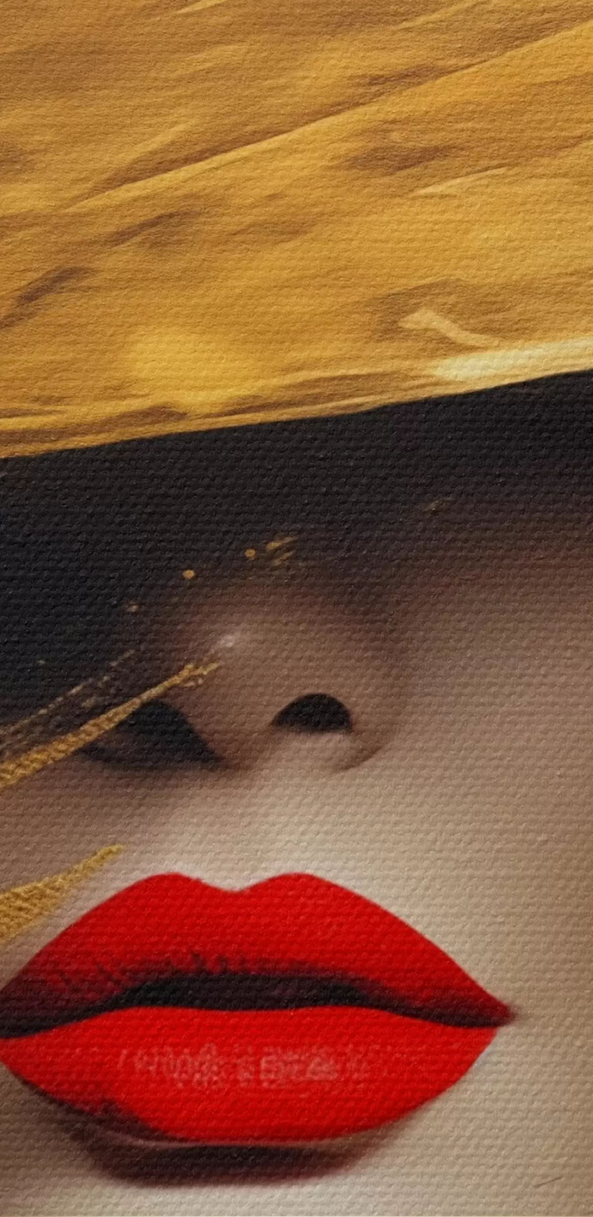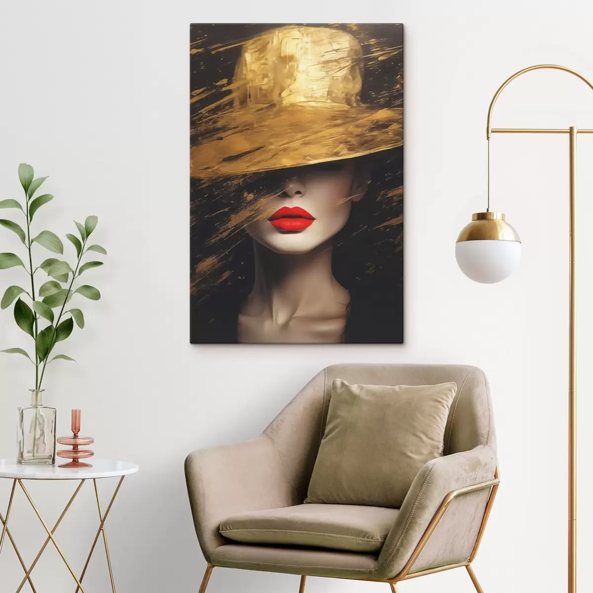 Schilderij Vrouwengezicht met rode lippenstift onder brede hoed Art. s44691