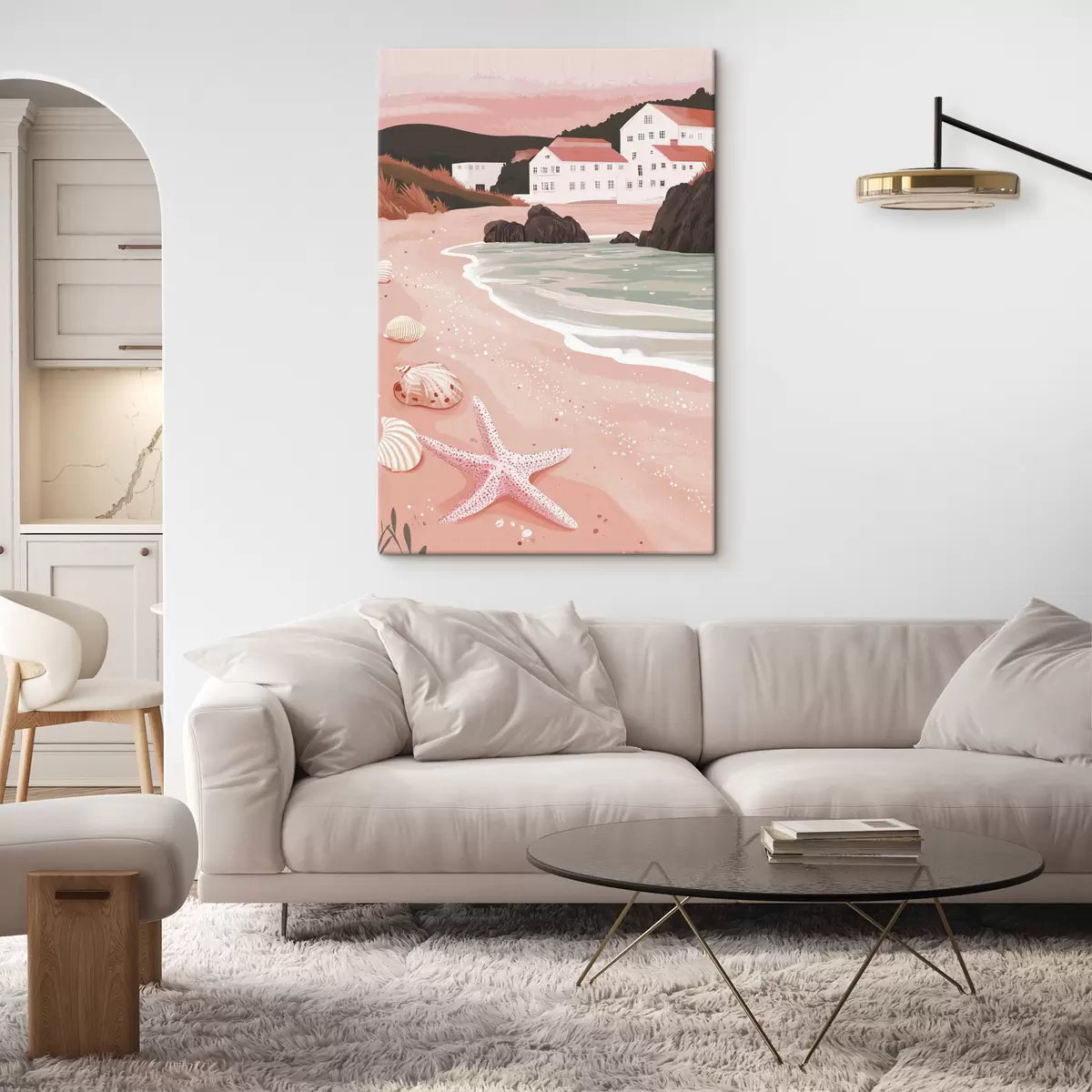 Schilderij Gezellig roze strand met witte huisjes en zeeschelpen Art. s44713