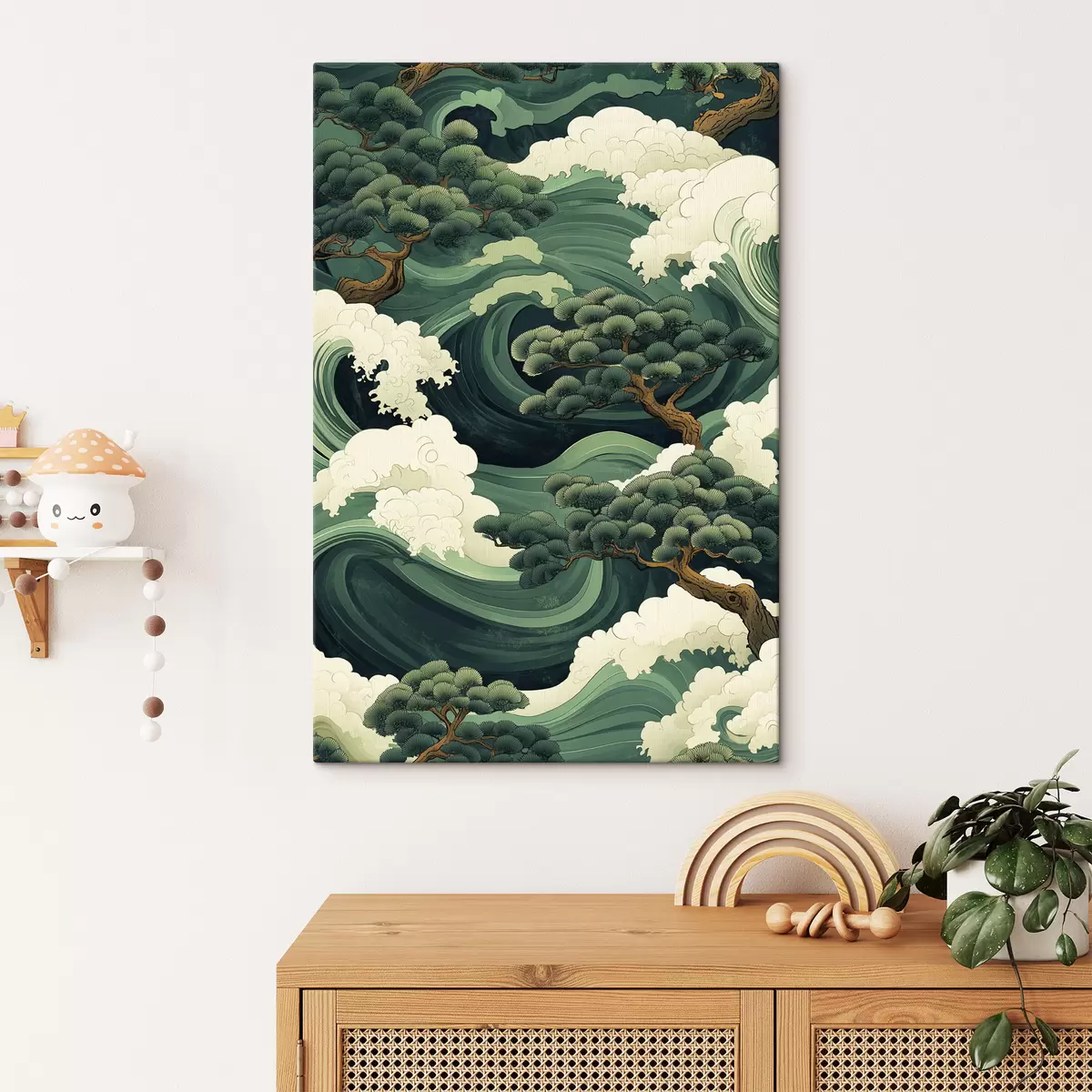 Schilderij Tekening in Chinese stijl met zeegolven en pijnbomen Art. s44719