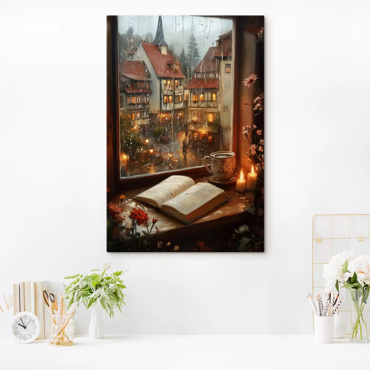 Schilderij Boek op de vensterbank, kaarsen, regenachtige dag, gezellig Art. s44722