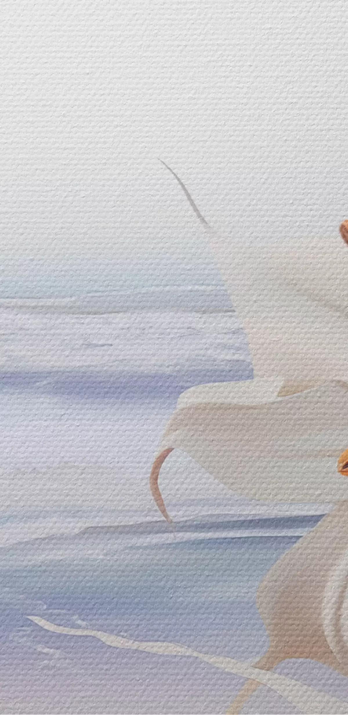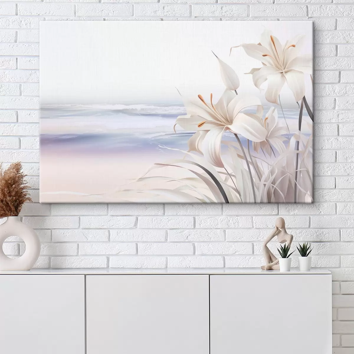 Schilderij Witte lelies met oranje stampers en lange bladeren op een strand met zachte golven op de achtergrond, pastelkleuren Art. s44850