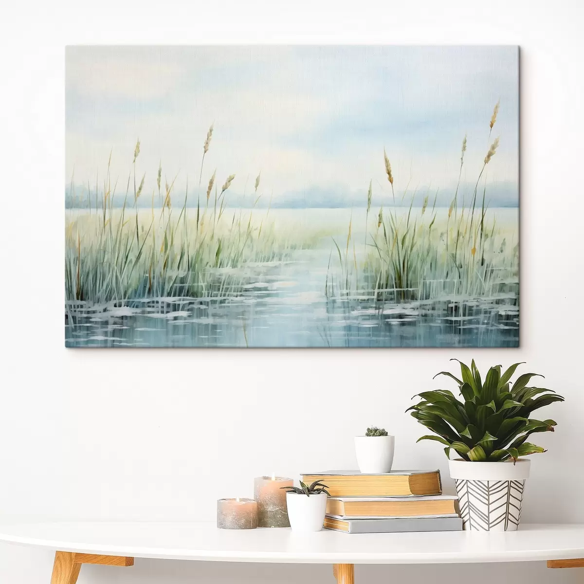 Schilderij Een aquarel schilderij imitatie van hoog gras groeit in de buurt van water, bewolkte lucht en onscherpe achtergrond Art. s44860