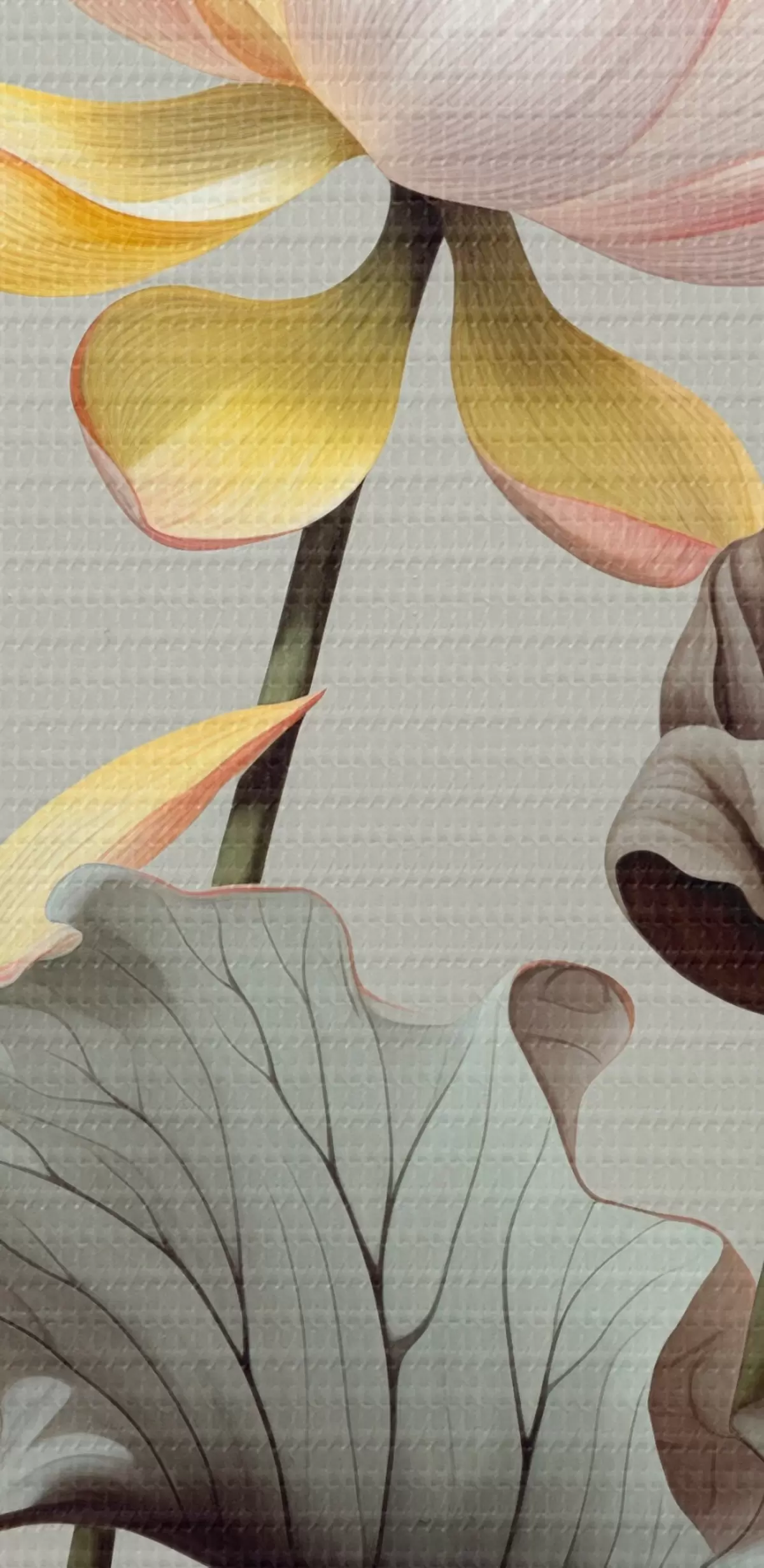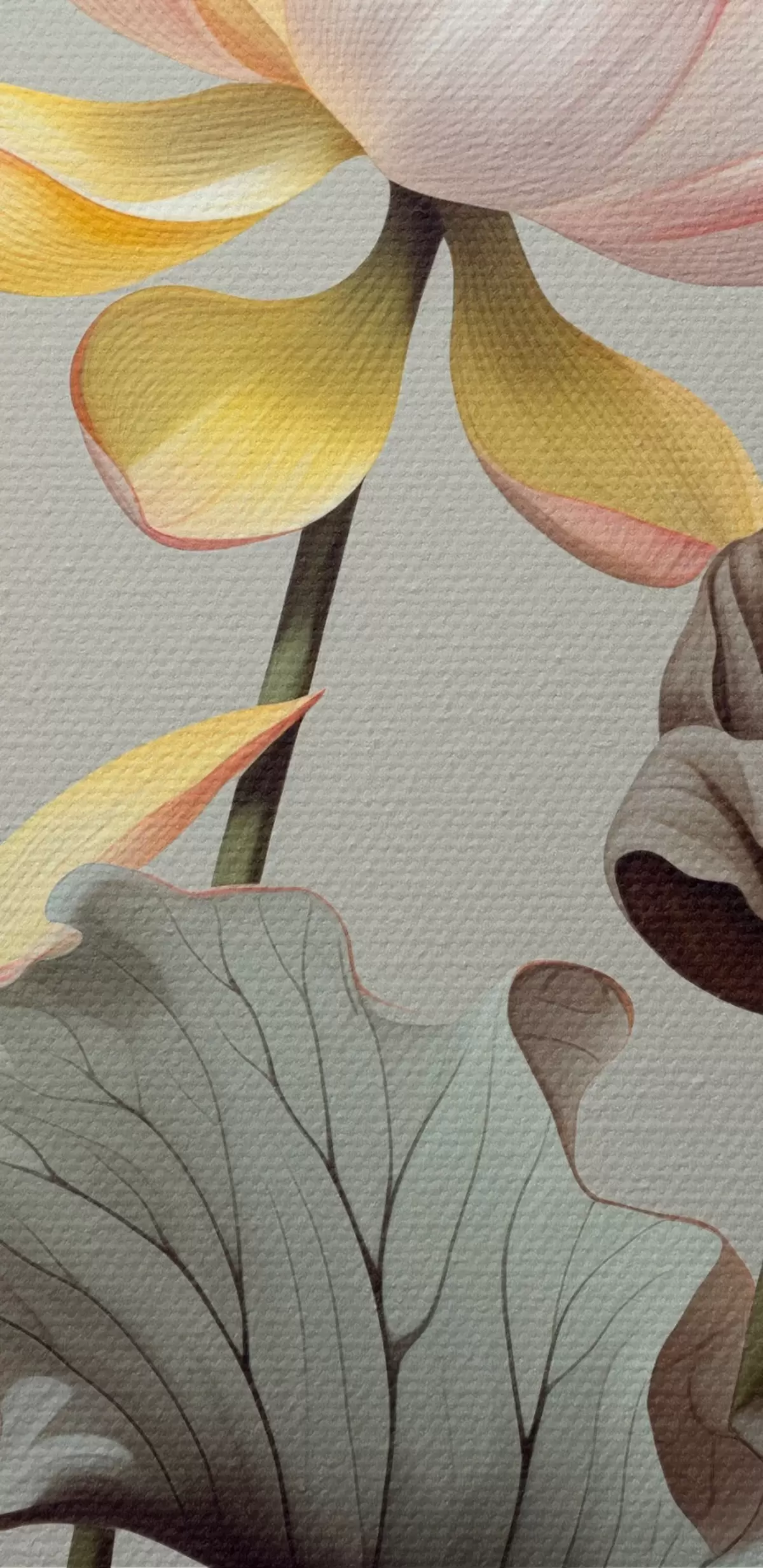 Schilderij Lotusbloemen met pastelkleurige bloemblaadjes en groene bladeren, in een gedempt kleurenpalet, tegen een effen achtergrond Art. s44862