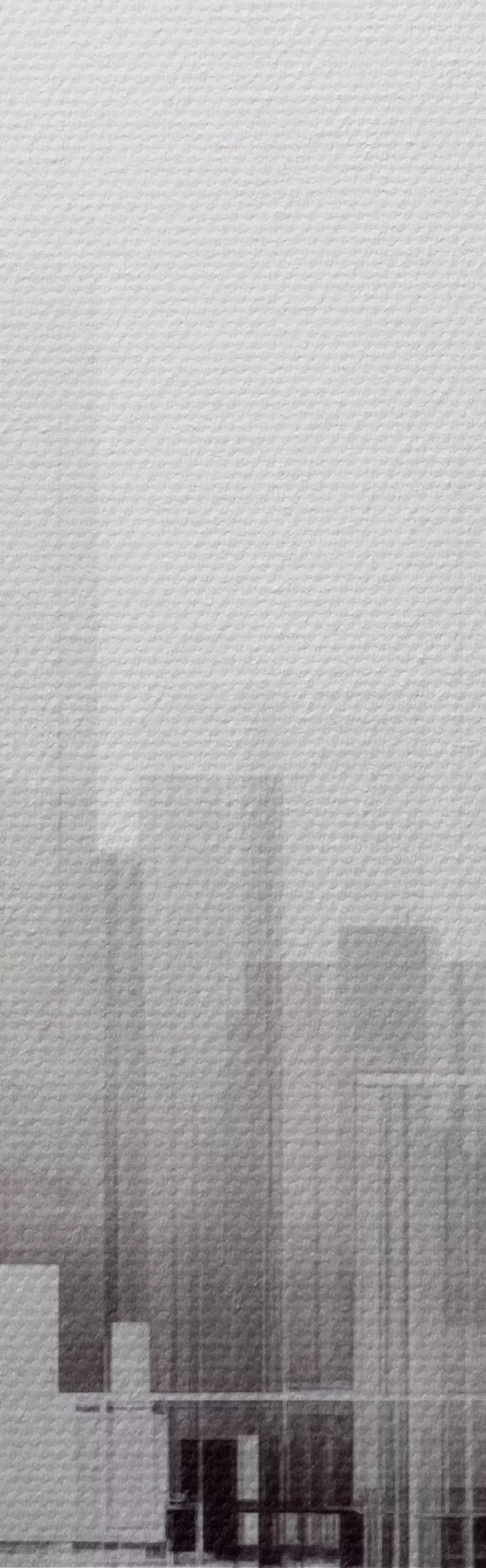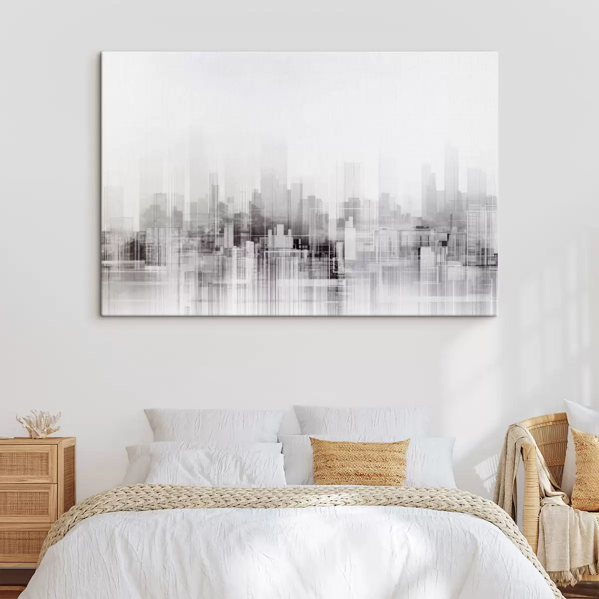 Schilderij Gestructureerd minimalistisch stadslandschap met hoge gebouwen en wolkenkrabbers, afgetekend tegen een witte lucht Art. s44863
