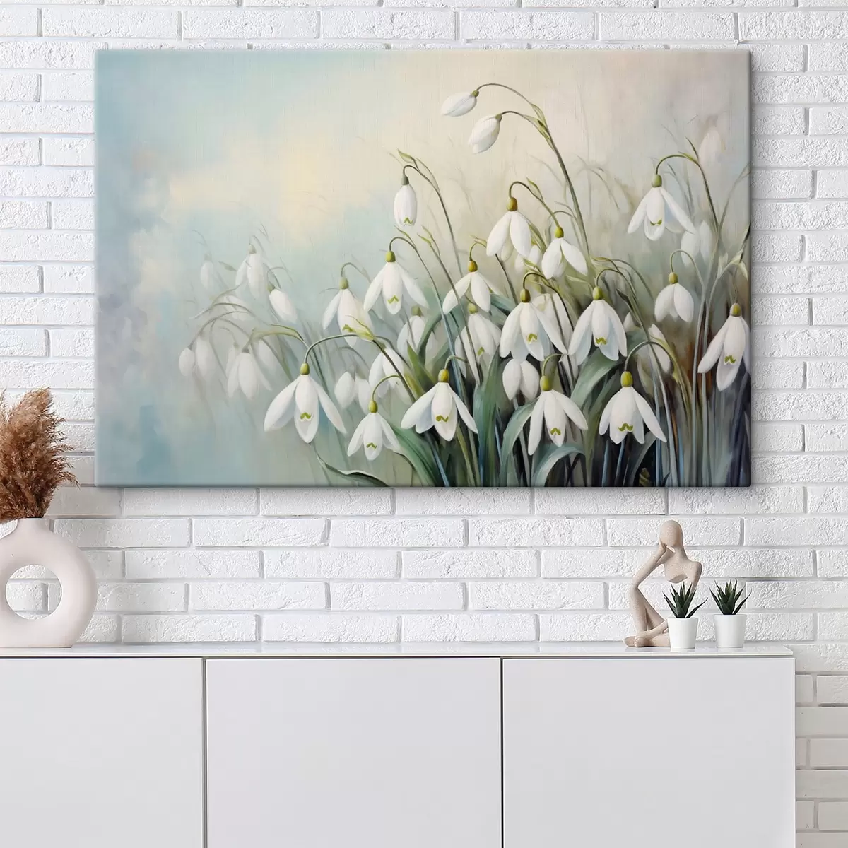 Schilderijen Witte sneeuwklokjesbloemen met blauwe en groene stengels en bladeren, zachte penseelstreken, onscherpe achtergrond  s44864