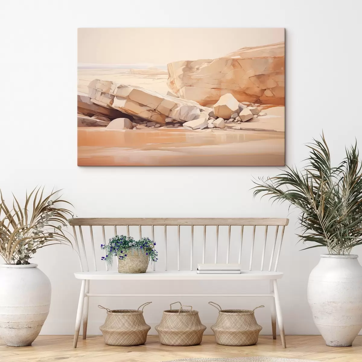 Schilderij Minimalistisch rotsstrandlandschap met grote lichtbruine keien en helder water Art. s44865