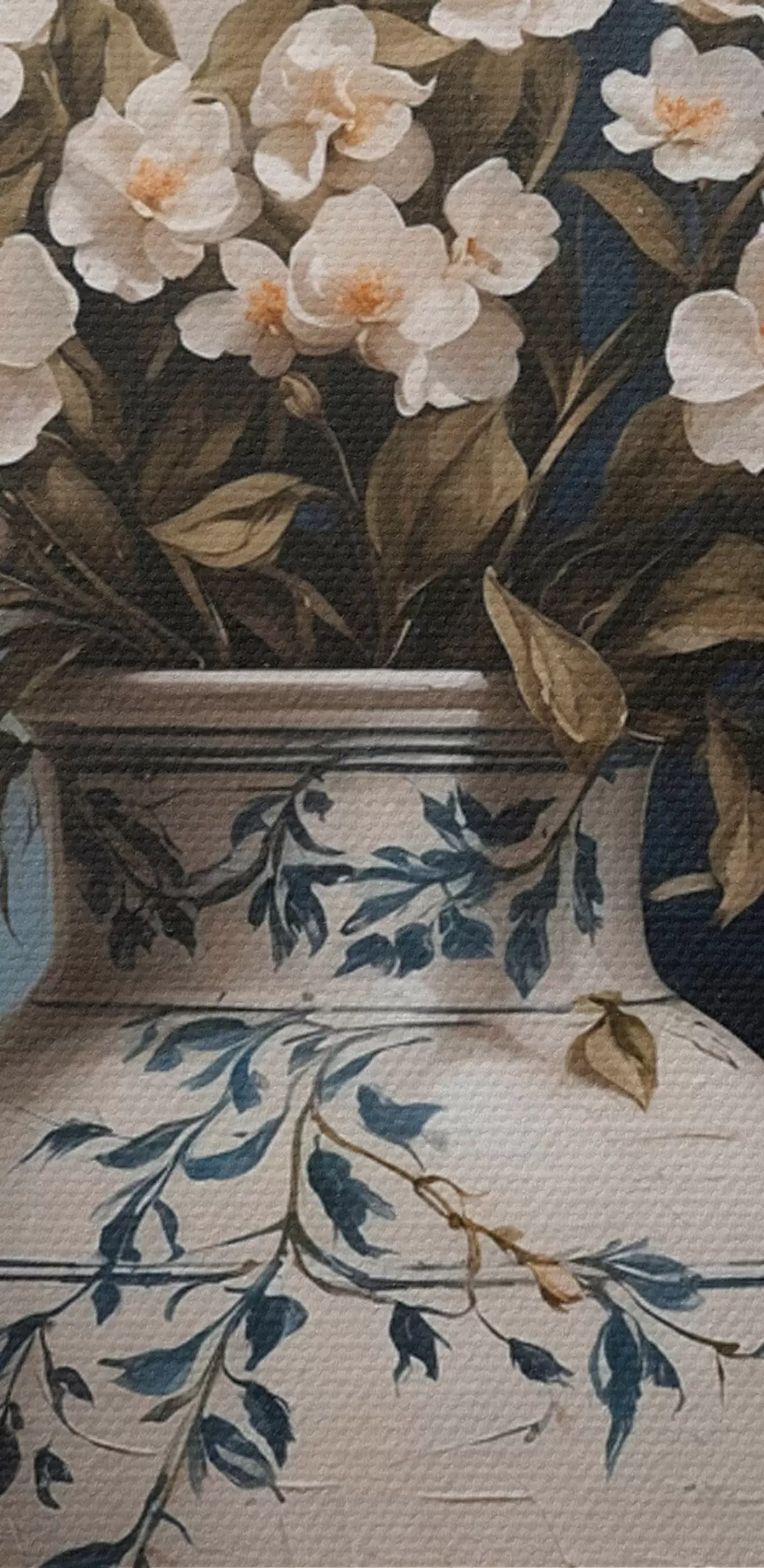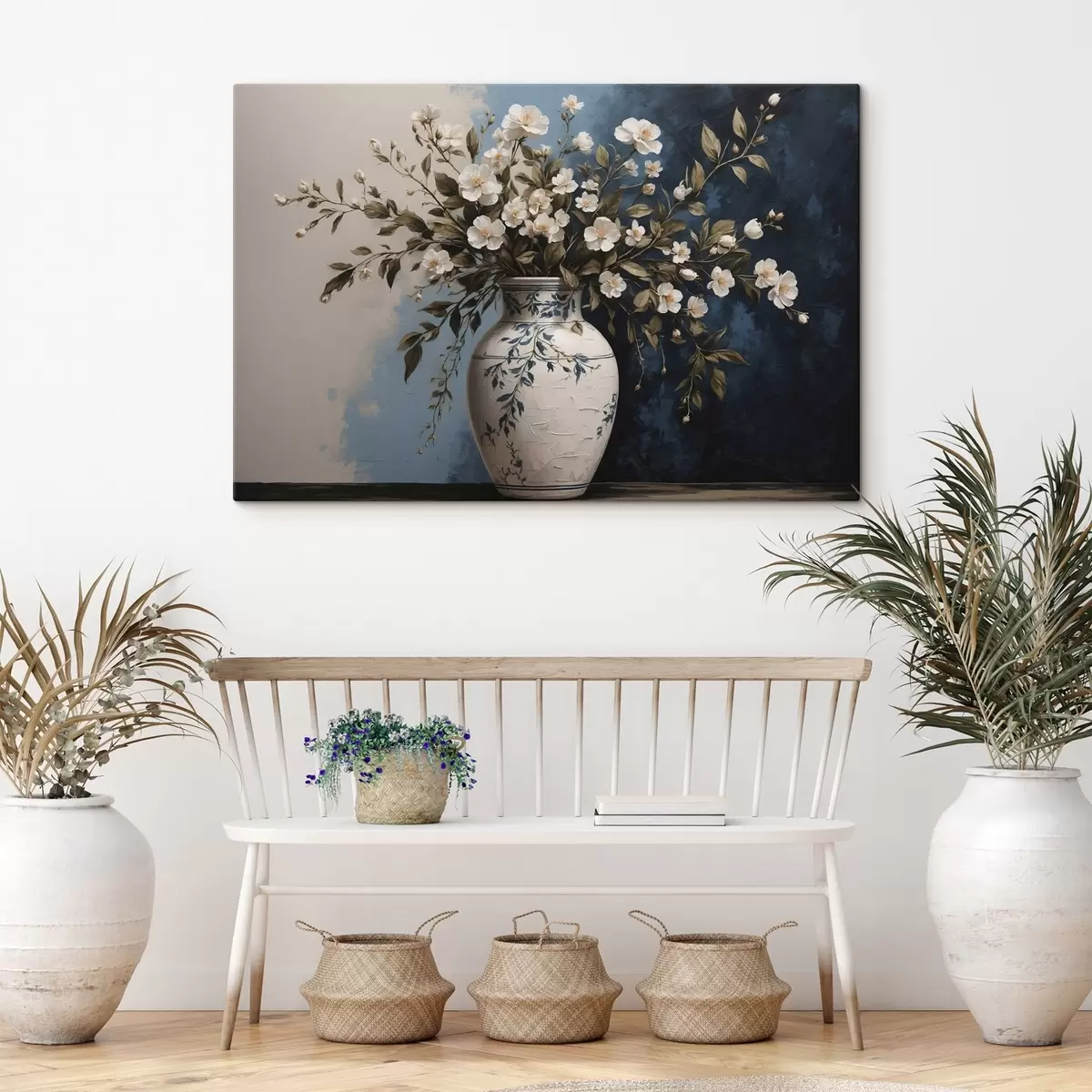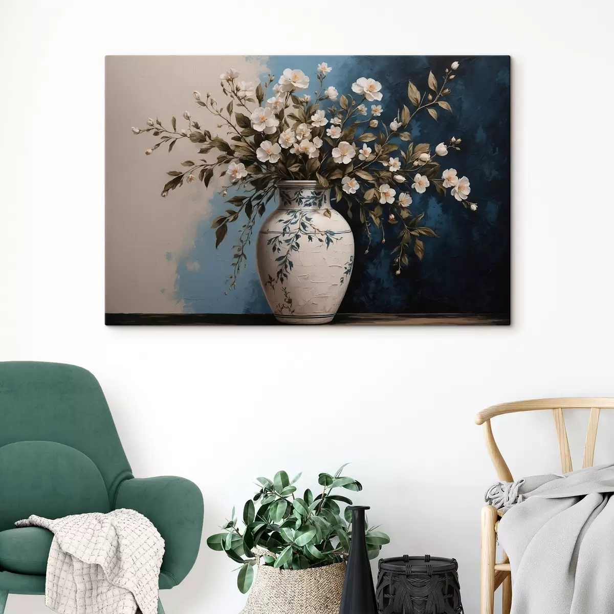 Schilderij Witte en gele bloemen in een grote vaas op een blauwe achtergrond Art. s44893