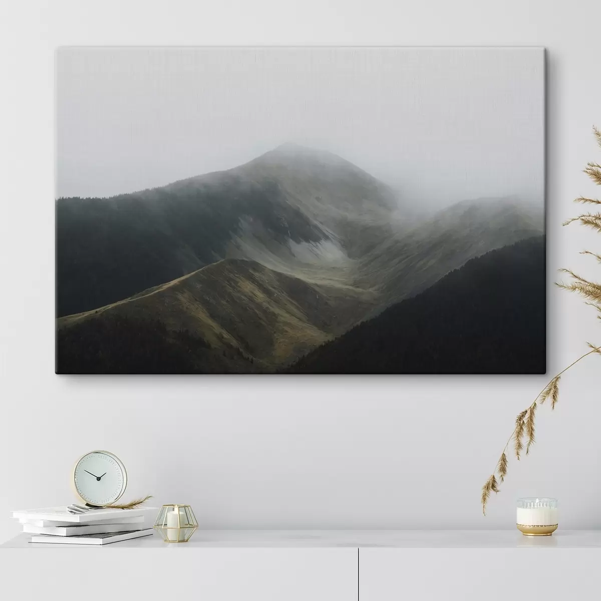 Je kunt het schilderij ophangen aan schroeven. Hiervoor leveren we bevestigingen bij onze foto's, zodat je de foto gemakkelijk kunt ophangen.
