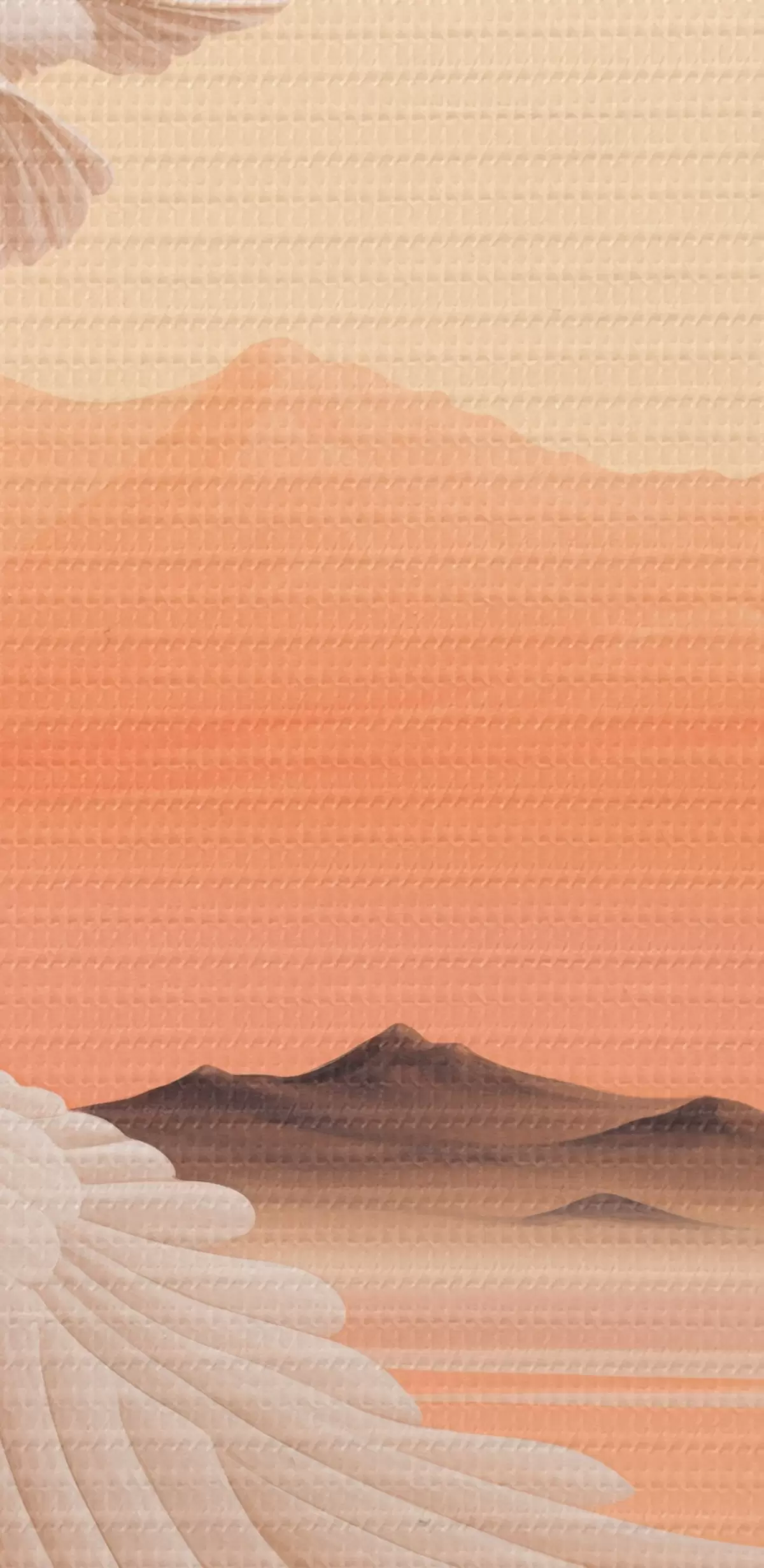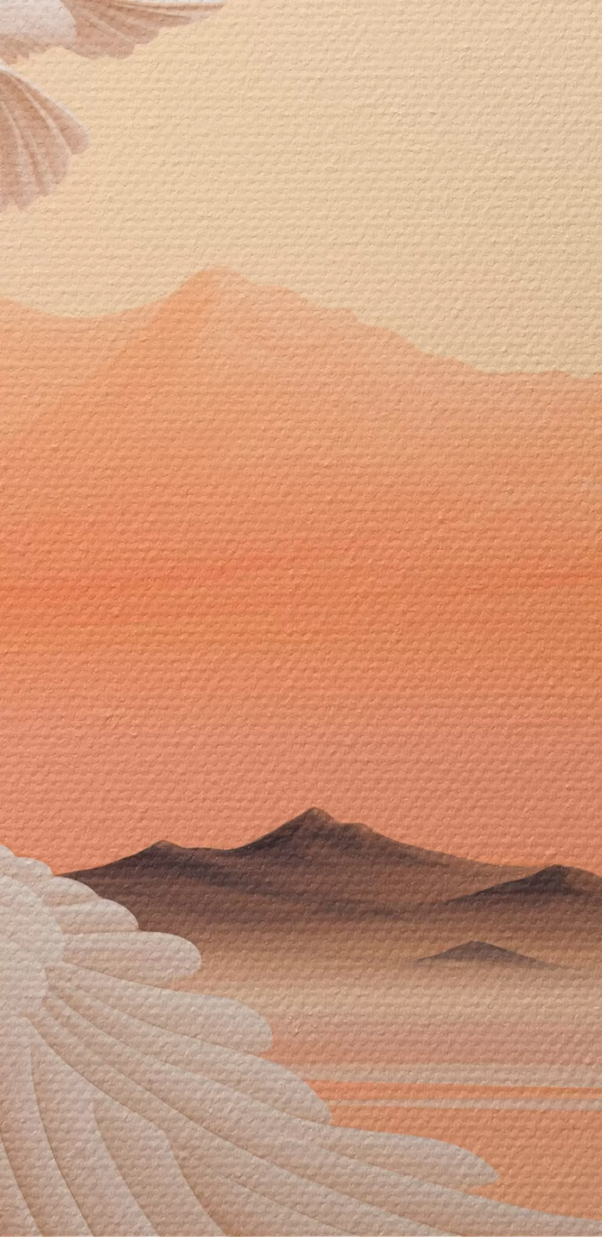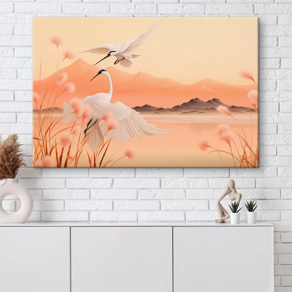 Schilderij Witte kraanvogels met roze riet op de voorgrond, bergen en een meer op de achtergrond, zacht oranje licht Art. s44925