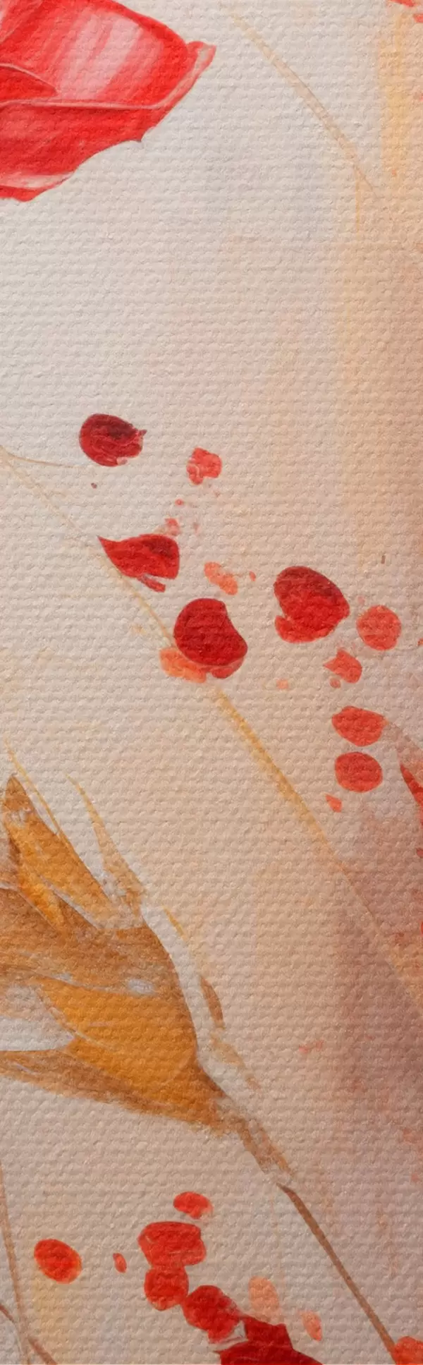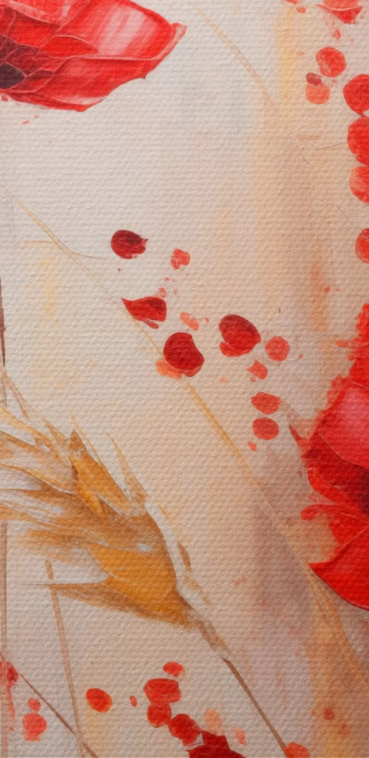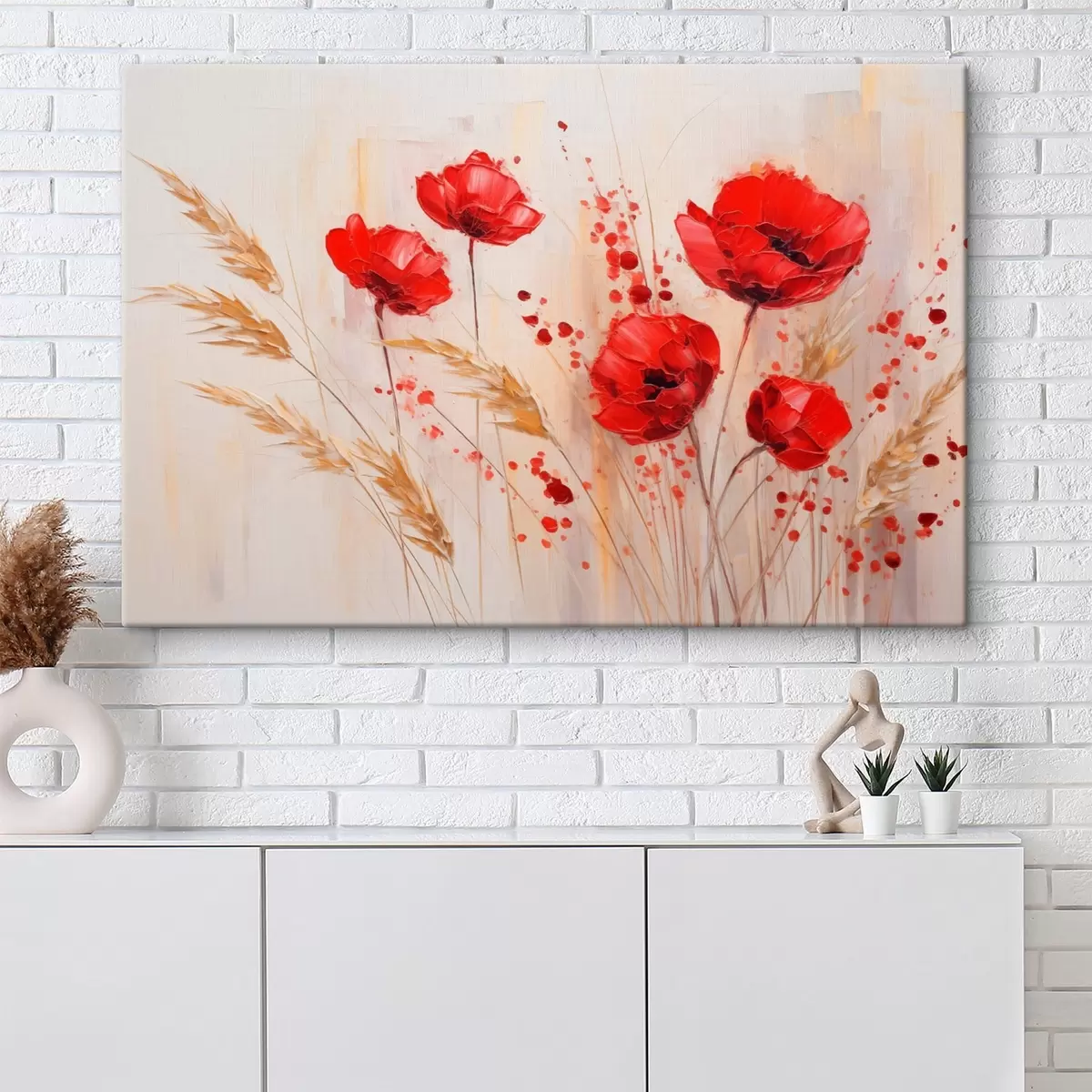 Schilderij Rode papaverbloemen met gele tarwestengels, tegen een zachte, neutrale achtergrond met spetters rode verf Art. s44926